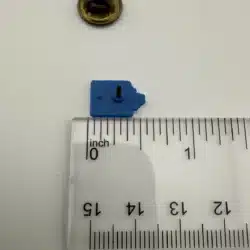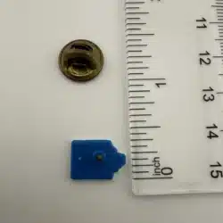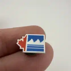This plastic pin showcases a striking design with half of a vibrant red maple leaf on the left, symbolizing Canada’s national identity. The right side features a stylized depiction of waves or mountains and water, evoking the natural beauty of Canada’s landscapes. Possibly a version of the flag of Scarborough.