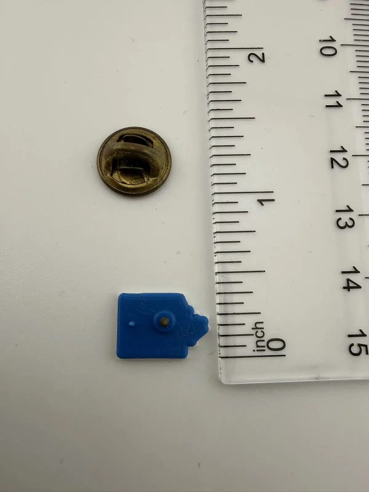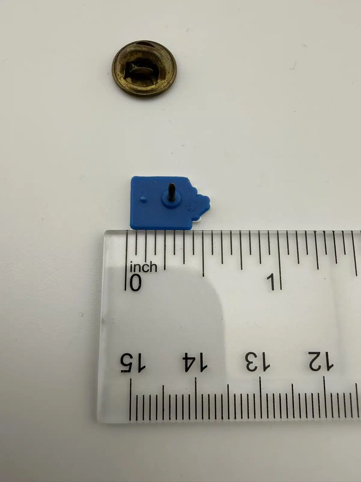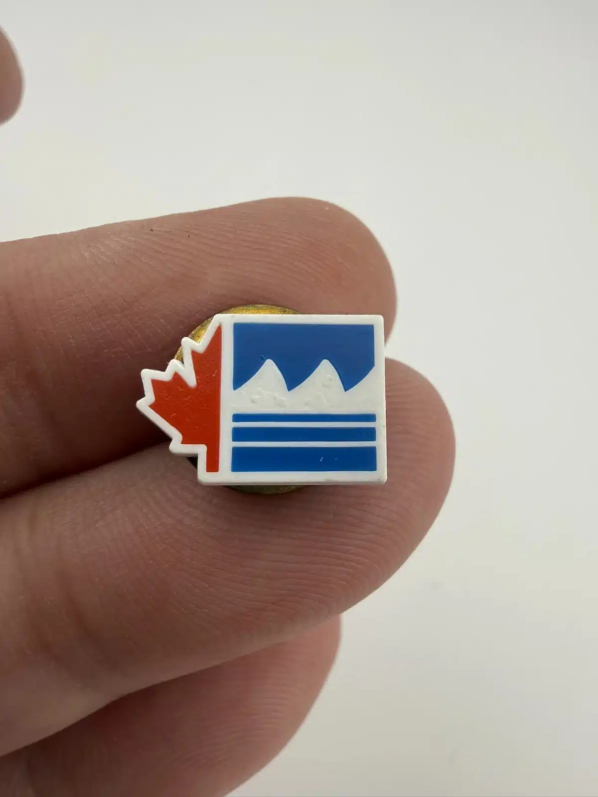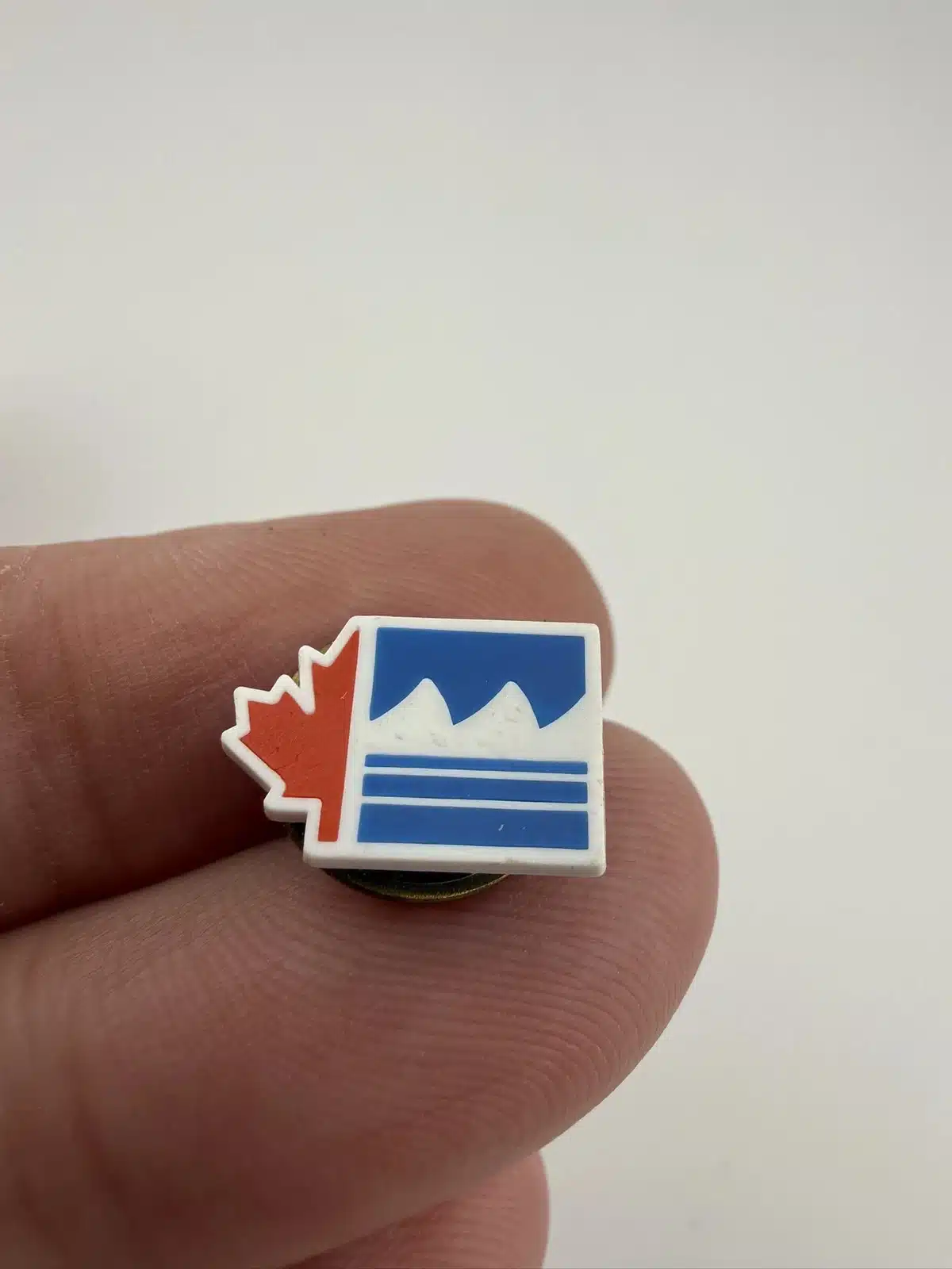 This plastic pin showcases a striking design with half of a vibrant red maple leaf on the left, symbolizing Canada’s national identity. The right side features a stylized depiction of waves or mountains and water, evoking the natural beauty of Canada’s landscapes. Possibly a version of the flag of Scarborough.