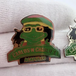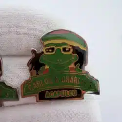 A frog wearing sunglasses takes center stage on this Carlos’n Charlie’s Acapulco pins, reflecting the playful branding associated with the well known Mexican restaurant and bar chain. The cartoon-style frog mascot has long been used in the company’s logos and merchandise tied to its lively nightlife locations.