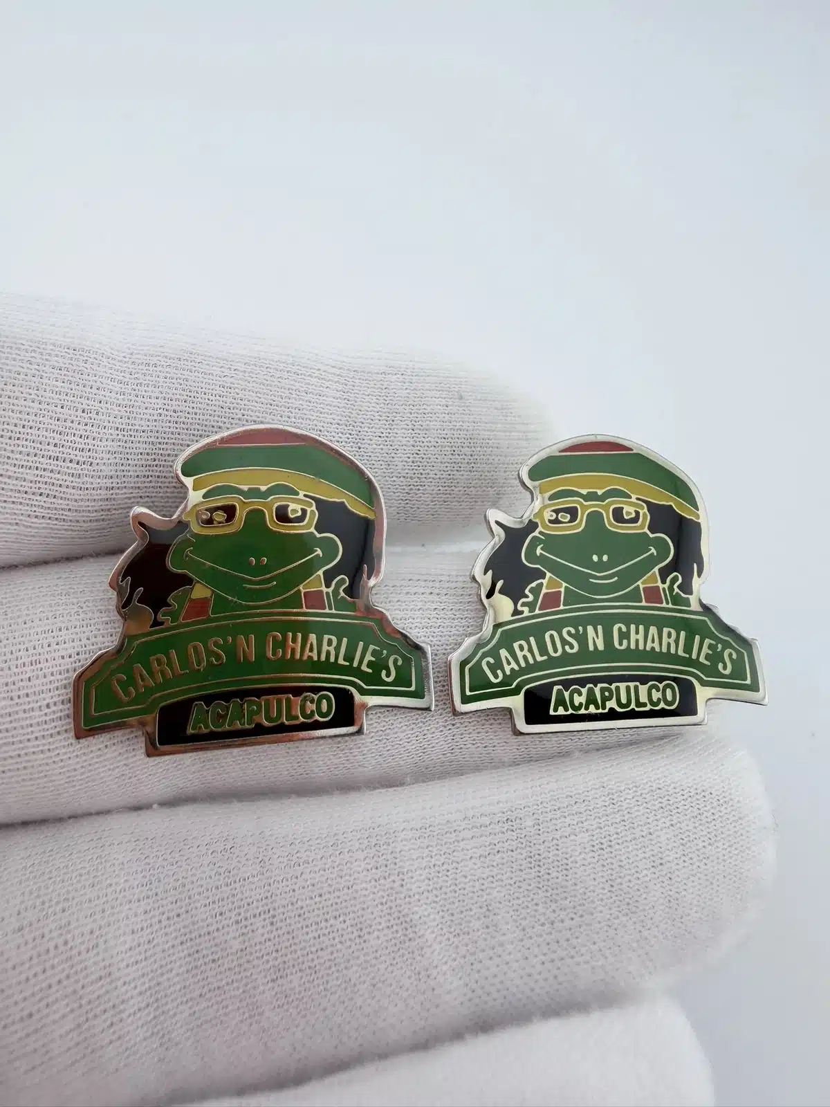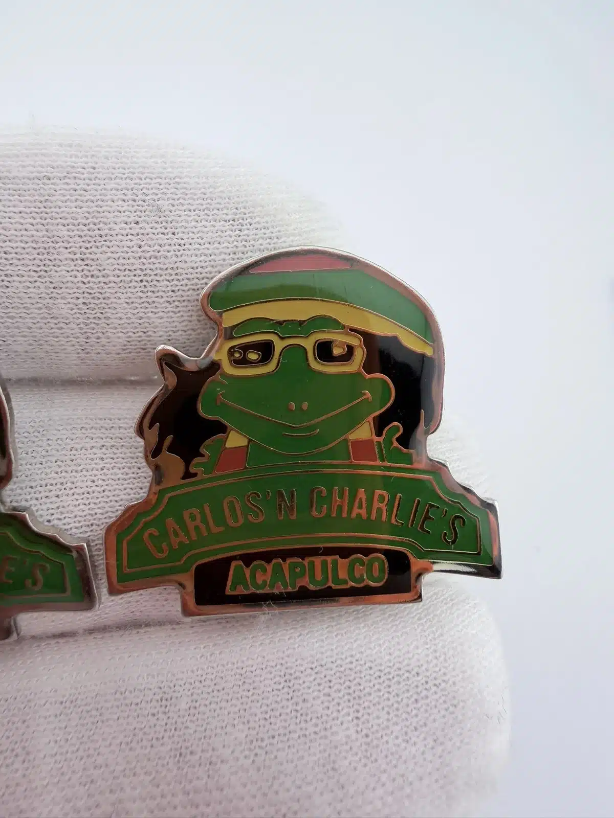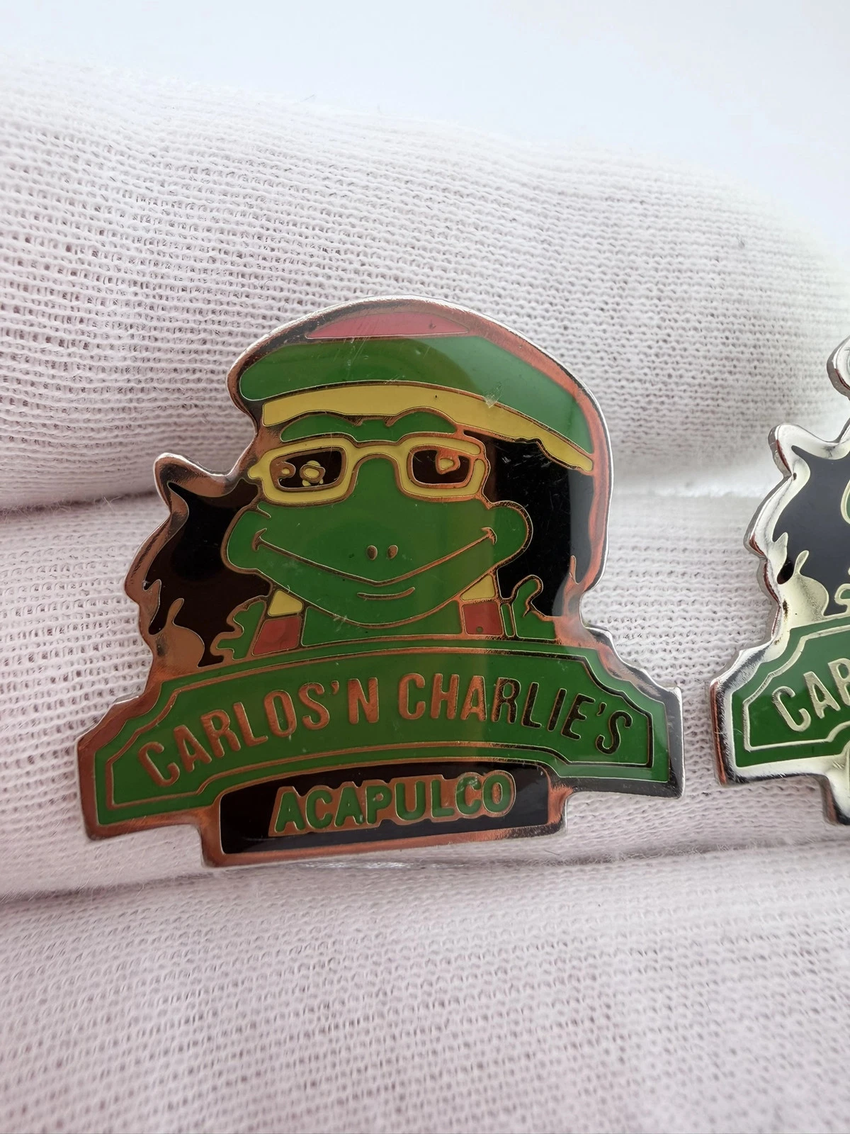 A frog wearing sunglasses takes center stage on this Carlos’n Charlie’s Acapulco pins, reflecting the playful branding associated with the well known Mexican restaurant and bar chain. The cartoon-style frog mascot has long been used in the company’s logos and merchandise tied to its lively nightlife locations.