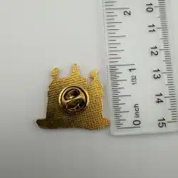 This lapel hat pin features a detailed depiction of a castle complete with flags, a drawbridge, and a surrounding moat, all rendered in vibrant colors.