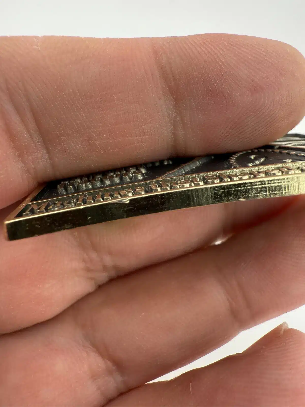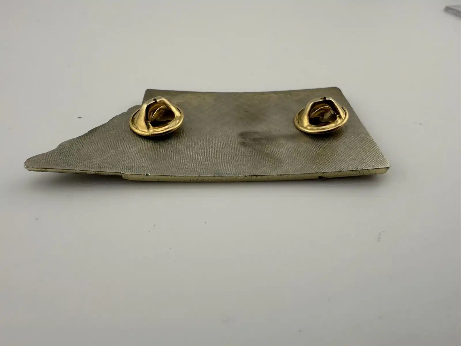 Used with marks including a ding at the bottom, scuff marks on gold tone outline, and age related buildup.