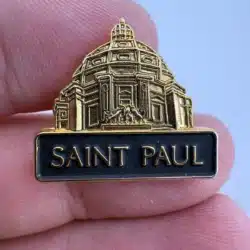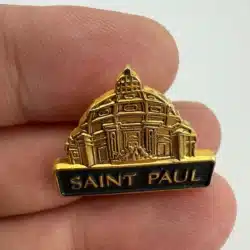 This souvenir lapel pin features a detailed representation of the Cathedral of Saint Paul, showcasing its iconic dome and architectural elements that reflect the Beaux-Arts style. The Cathedral, completed in 1915, is a prominent landmark in Minnesota.