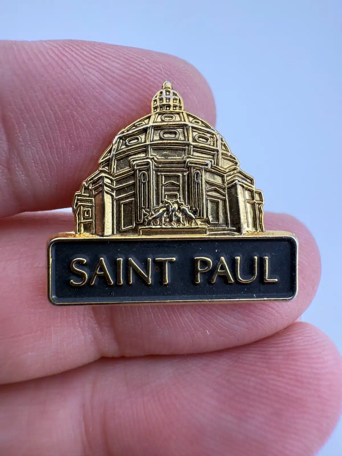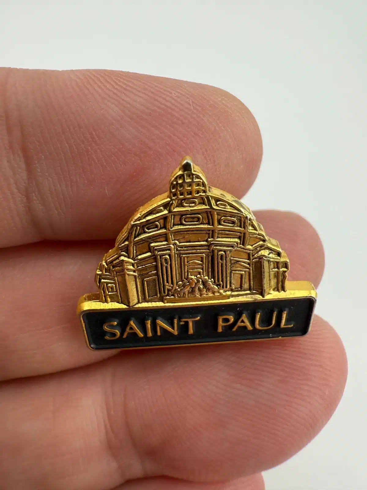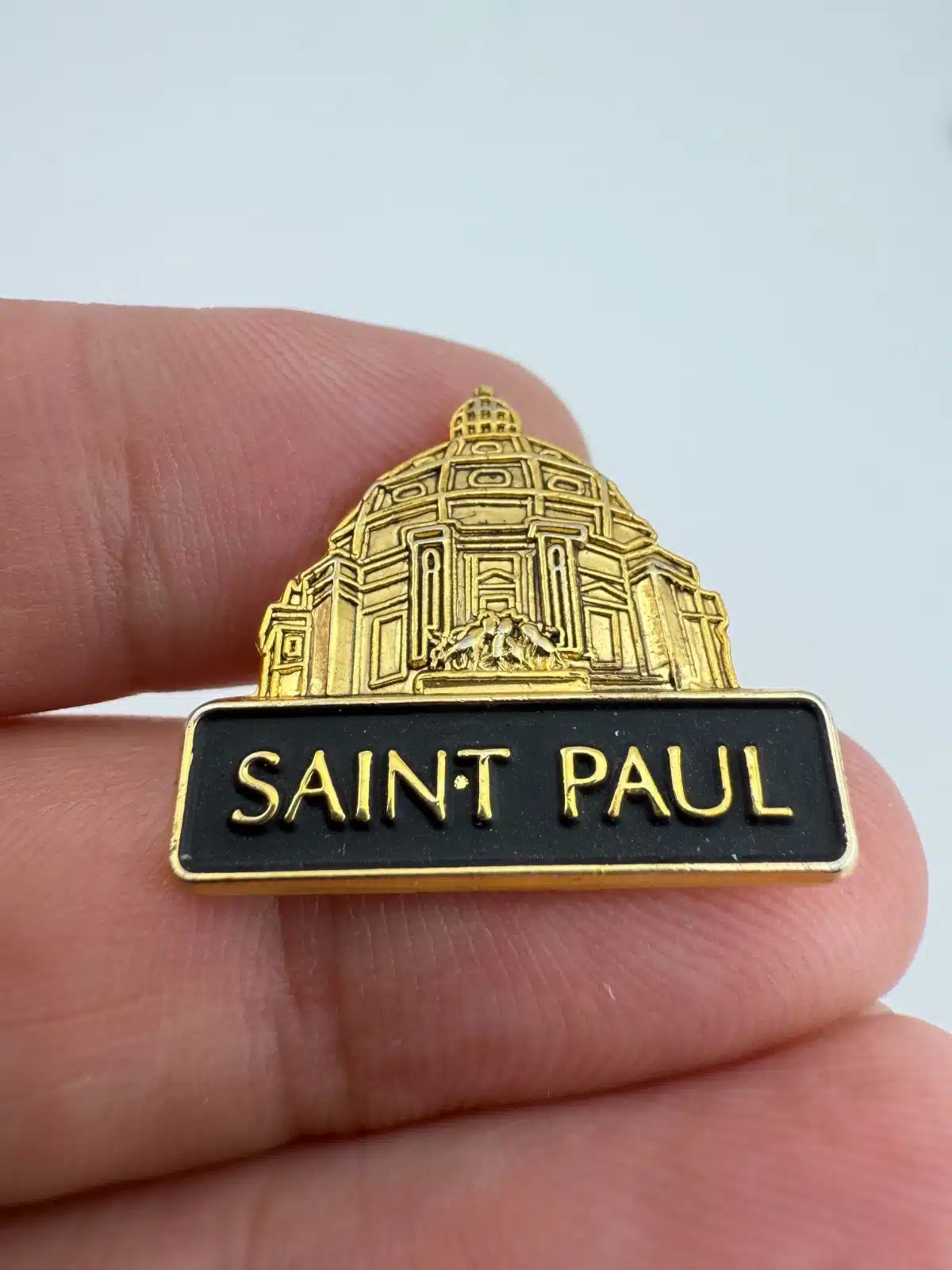 This souvenir lapel pin features a detailed representation of the Cathedral of Saint Paul, showcasing its iconic dome and architectural elements that reflect the Beaux-Arts style. The Cathedral, completed in 1915, is a prominent landmark in Minnesota.