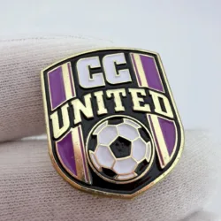 This pin has a crest shaped design with the letters “CC” in white at the top. Below that it reads “United” in gold tone, and at the bottom is a black and white soccer ball.