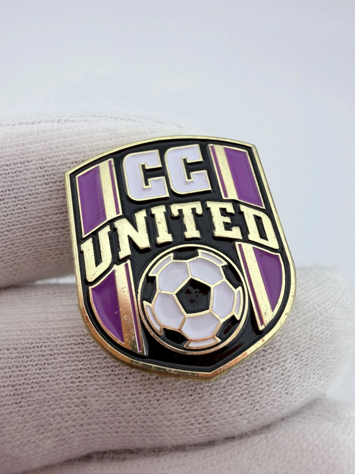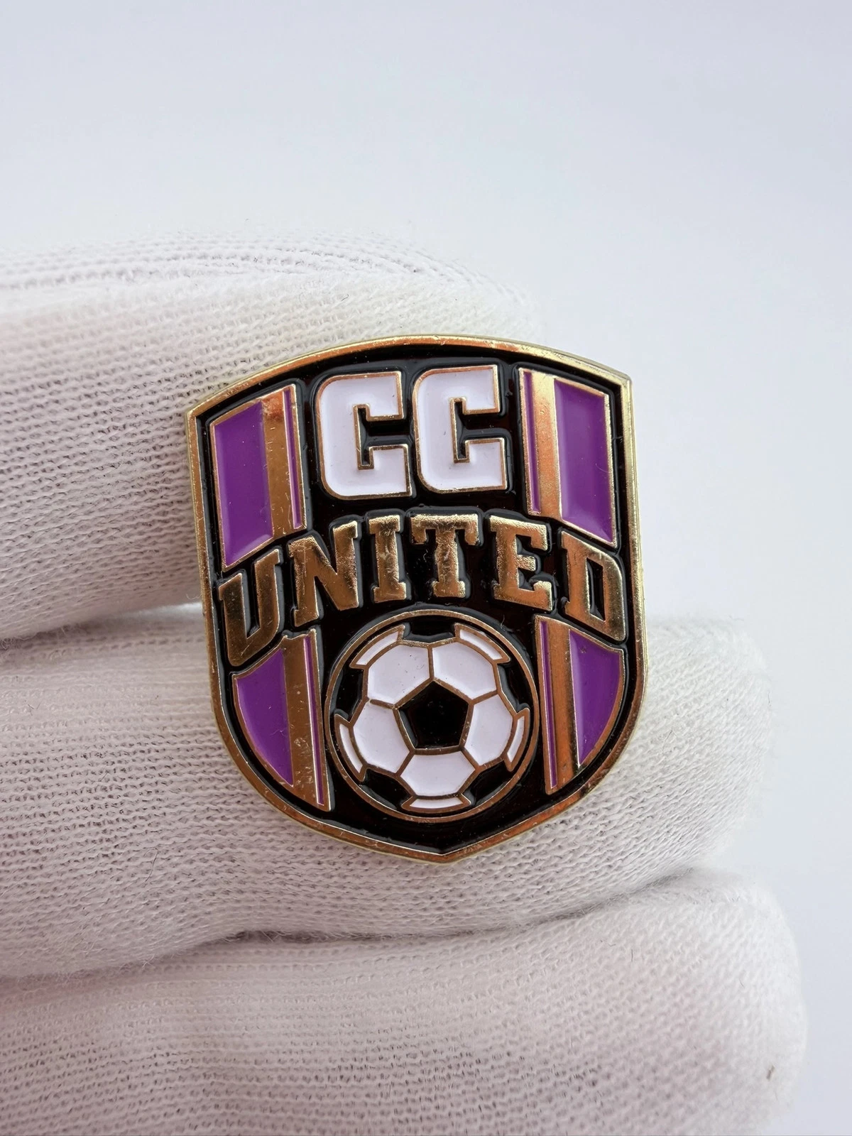 This pin has a crest shaped design with the letters “CC” in white at the top. Below that it reads “United” in gold tone, and at the bottom is a black and white soccer ball.