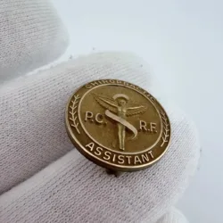 This pin is circular with a gold tone finish and reads “Chiropractic Assistant” around the outer edge. Inside the center area it has the letters “P.C.” on the left and “R.F.” on the right, with a female angel at the center shown with her winged arms spread open. The rear is marked GF for gold fill.