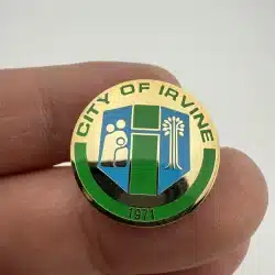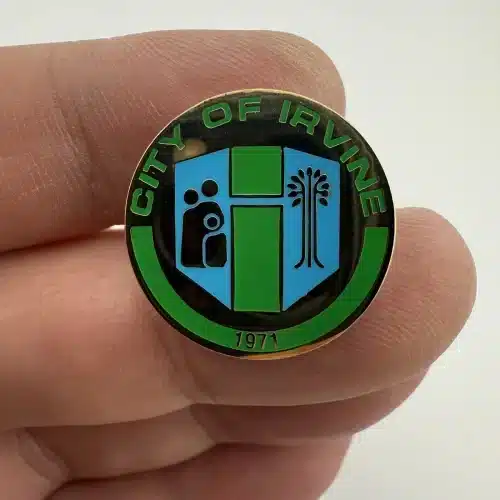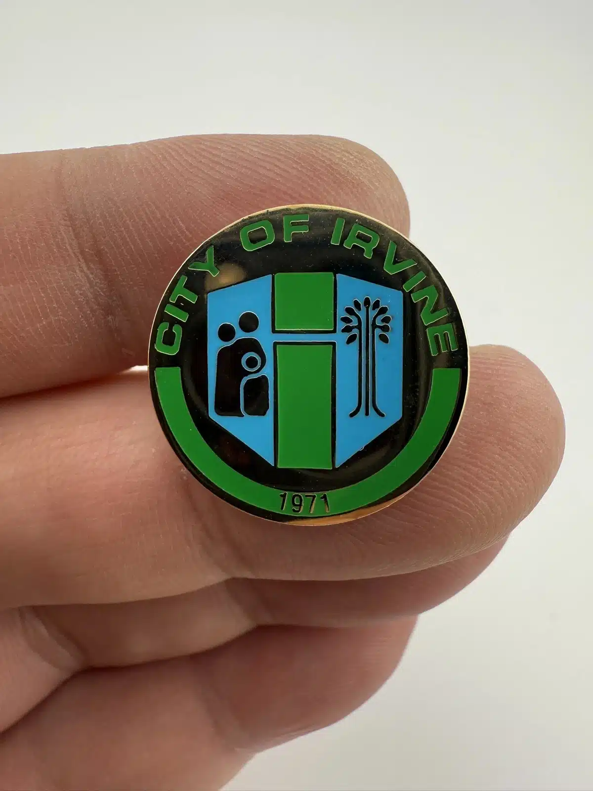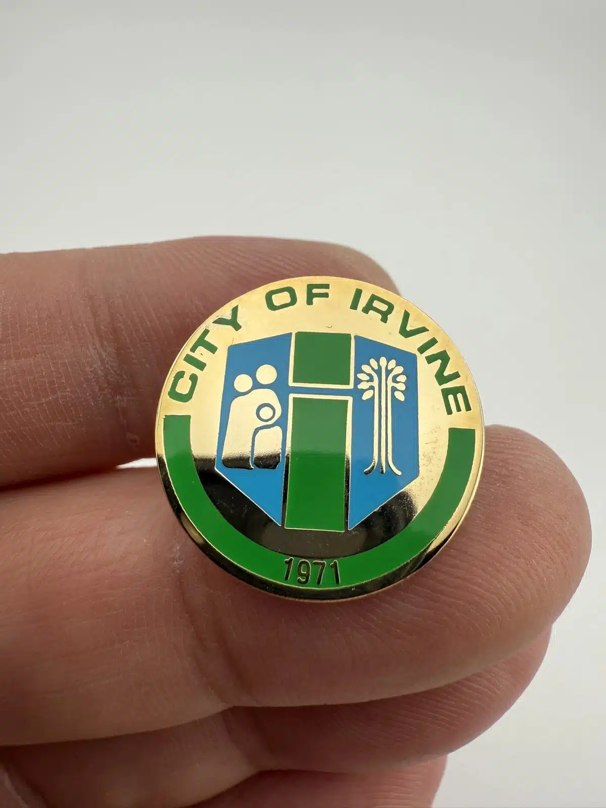This City Of Irvine Pin features their seal, which consists of a family on the left, the letter I in the middle for Irvine, and surprisingly – asparagus on the right!