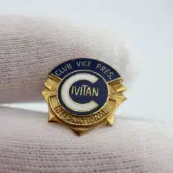 This Civitan International Club Vice President tie tack pin features a prominent ‘Club Vice Pres.’ inscription at the top, with the Civitan logo elegantly displayed in the center. The pin is crafted in gold tone with white and blue enamel accents, representing the values and community service focus of the Civitan organization.