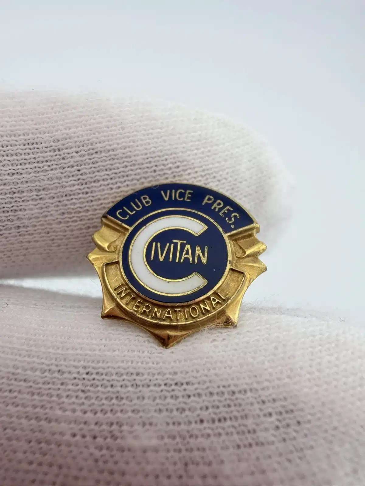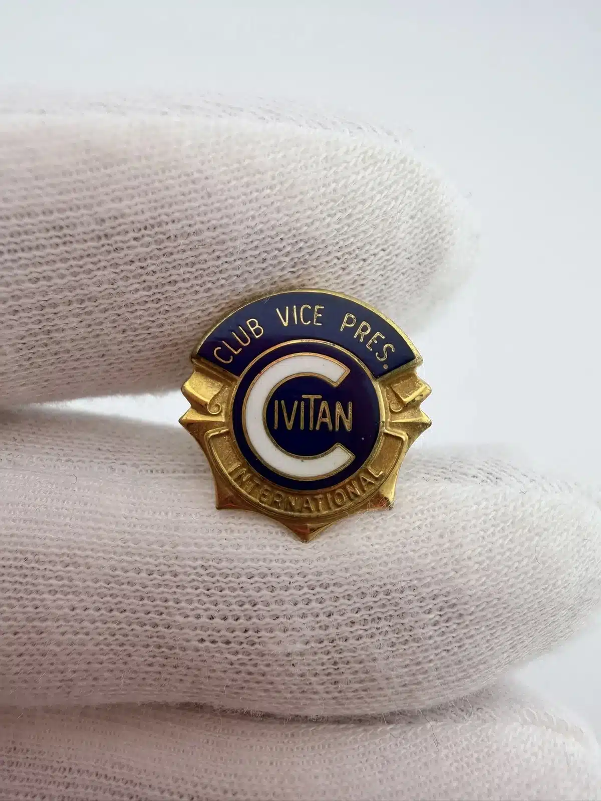 This Civitan International Club Vice President tie tack pin features a prominent ‘Club Vice Pres.’ inscription at the top, with the Civitan logo elegantly displayed in the center. The pin is crafted in gold tone with white and blue enamel accents, representing the values and community service focus of the Civitan organization.
