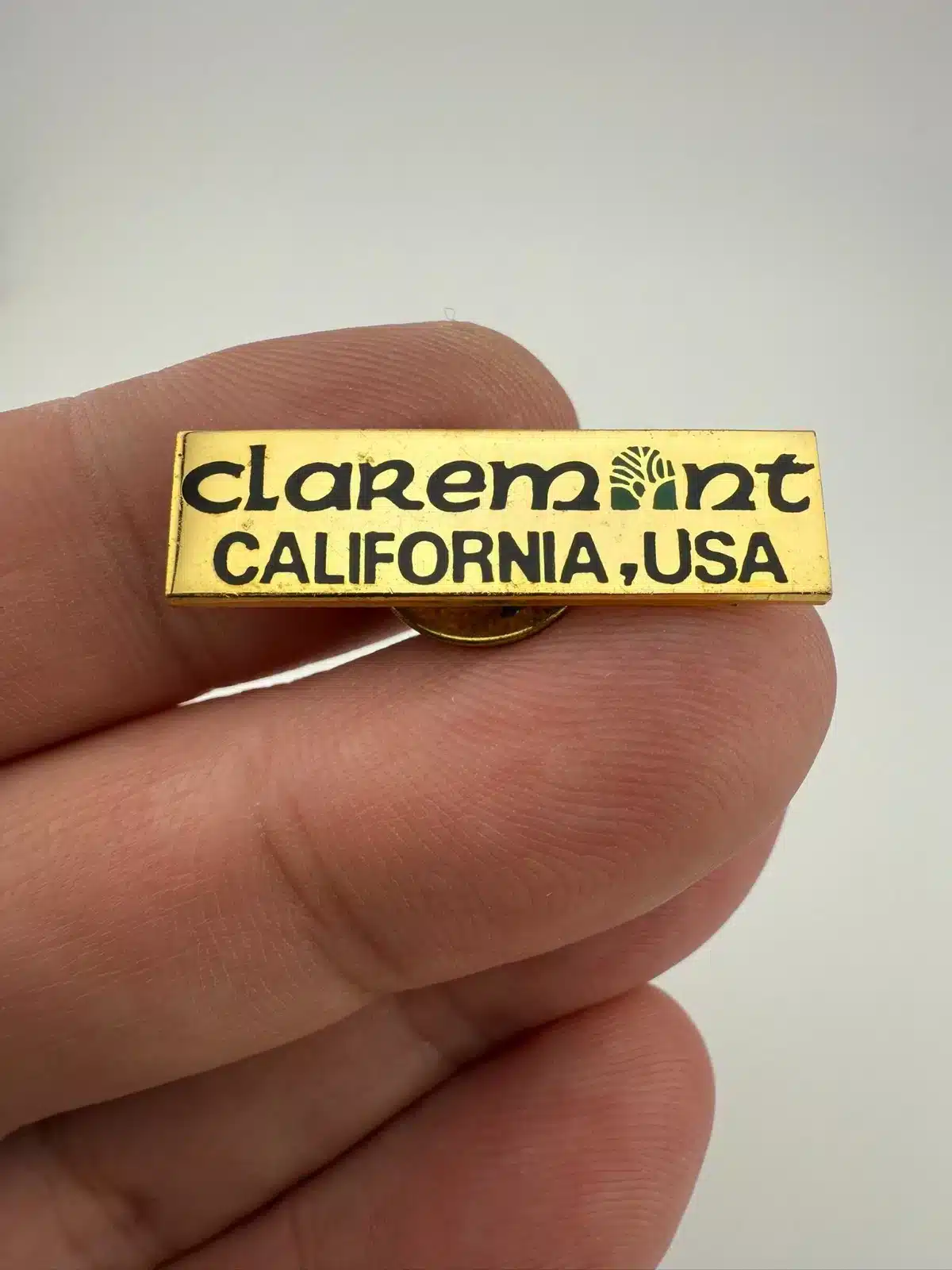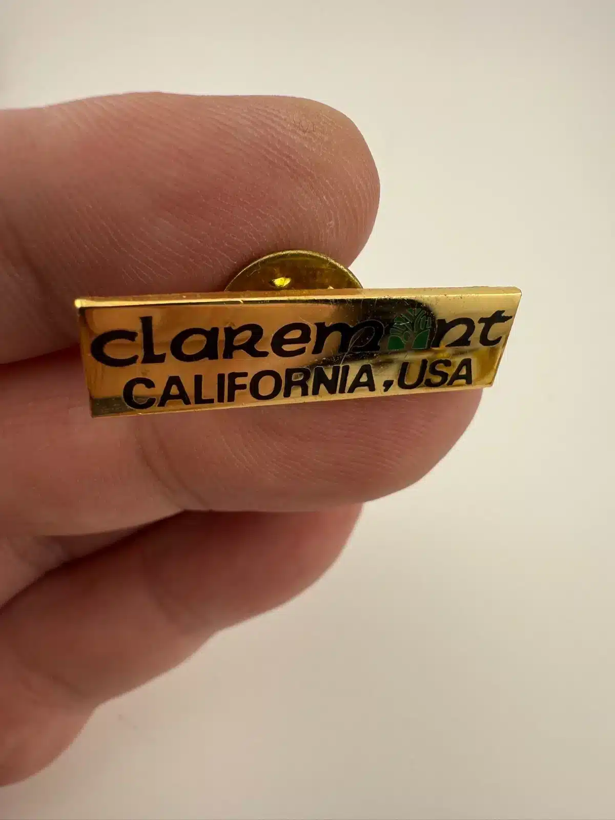 This Claremont, California lapel pin features a straightforward design with ‘Claremont California USA’ text prominently displayed.
