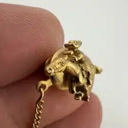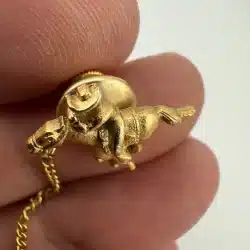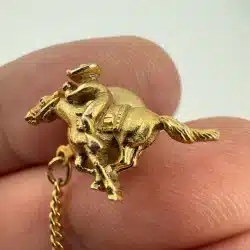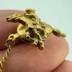 A highly detailed gold tone tie tack pin featuring a cowboy on a running horse, with the rider gripping the reins. The pin includes a chain and bar for added security and style.