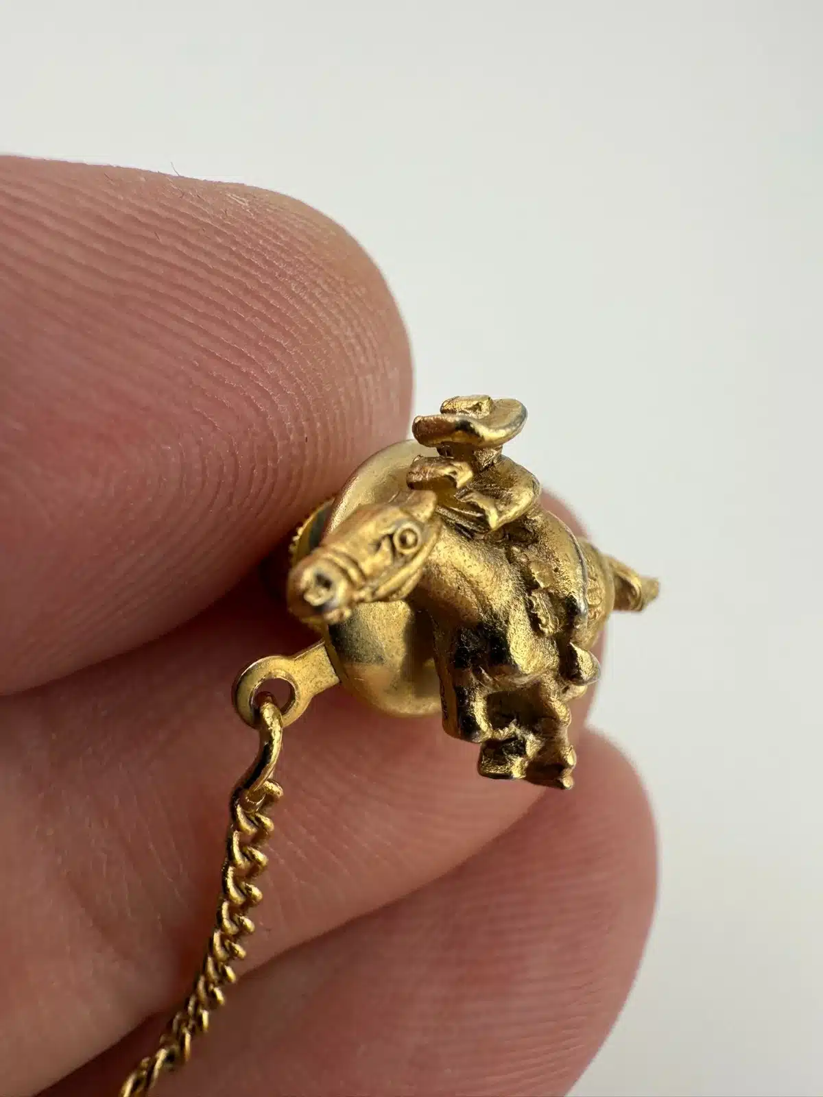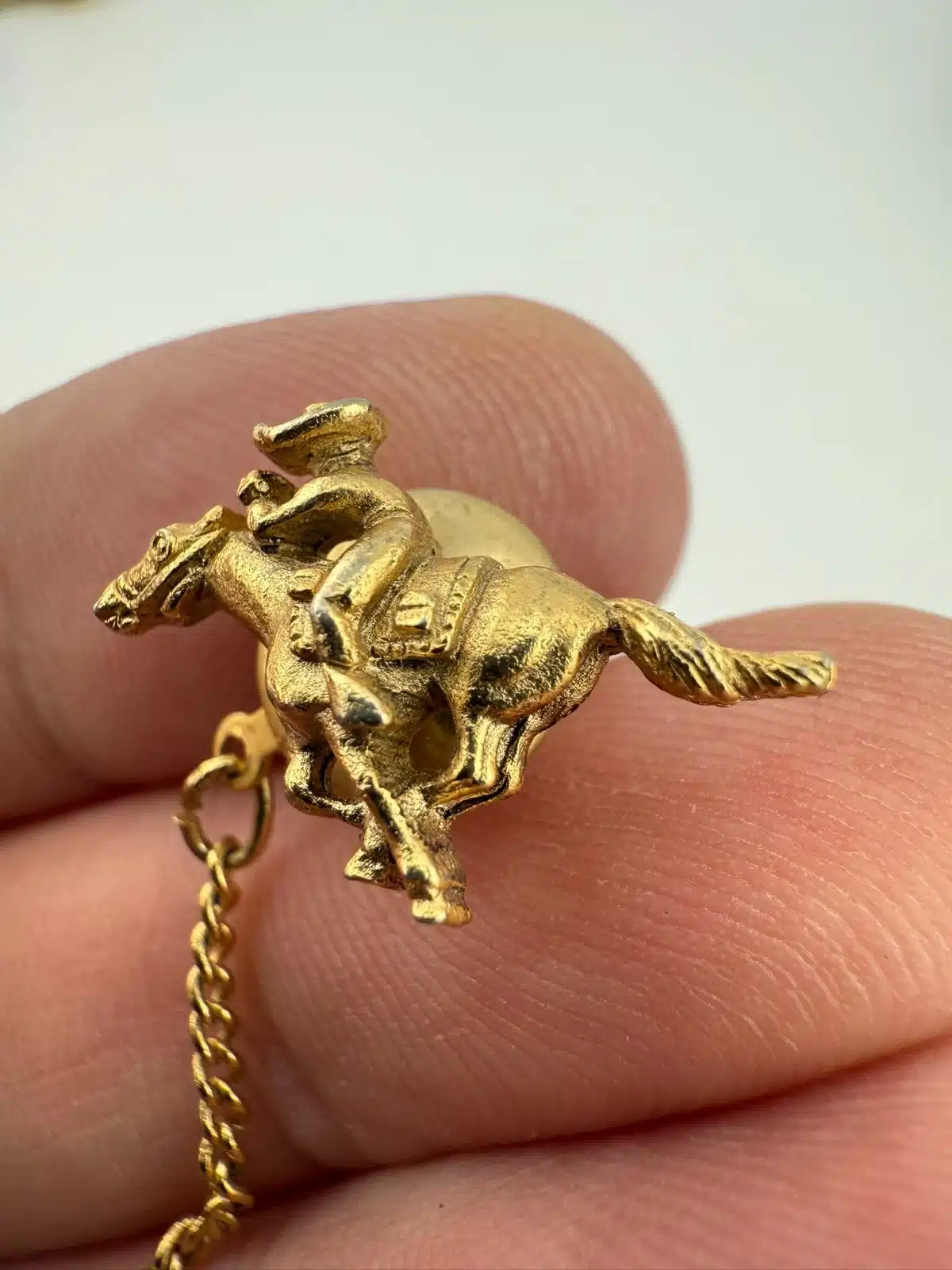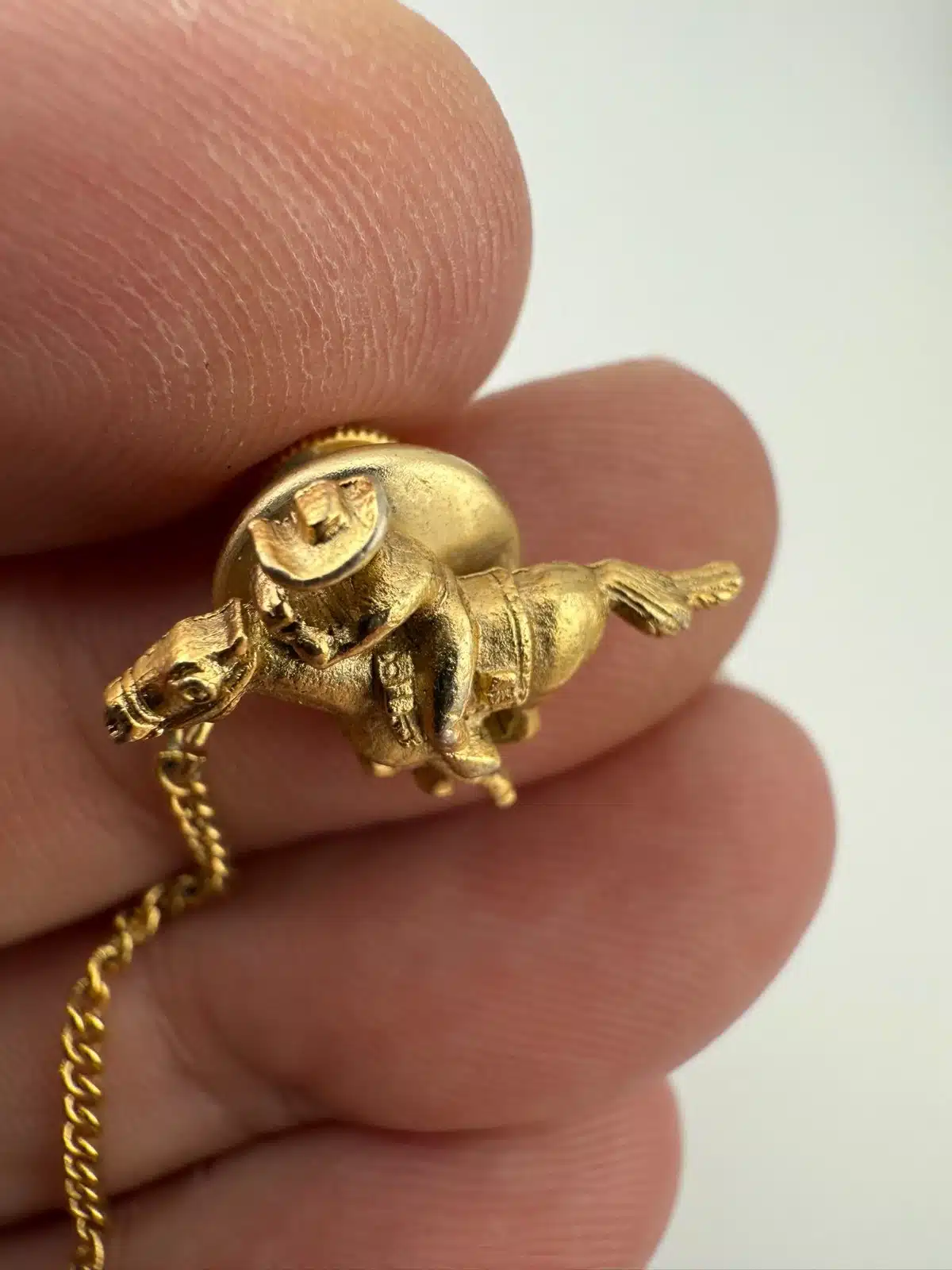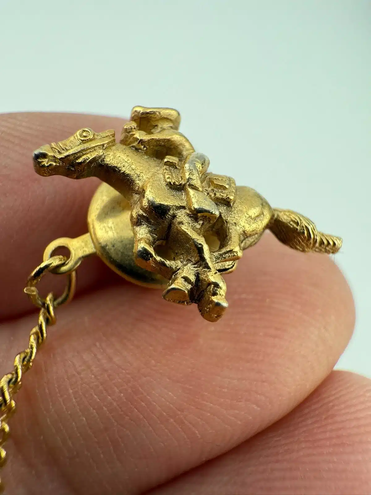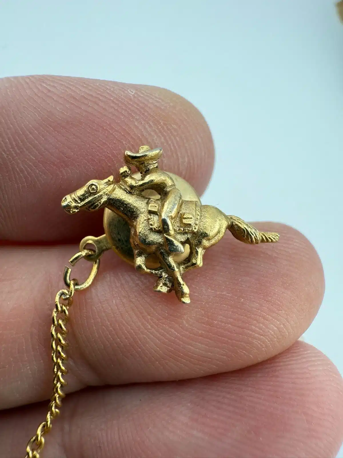 A highly detailed gold tone tie tack pin featuring a cowboy on a running horse, with the rider gripping the reins. The pin includes a chain and bar for added security and style.