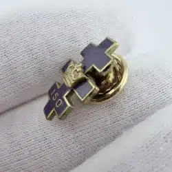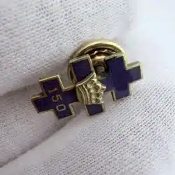 This pin features a unique cross shape with purple enamel and a gold tone crown at the center. It also features the number 150. Unsure on the exact meaning.