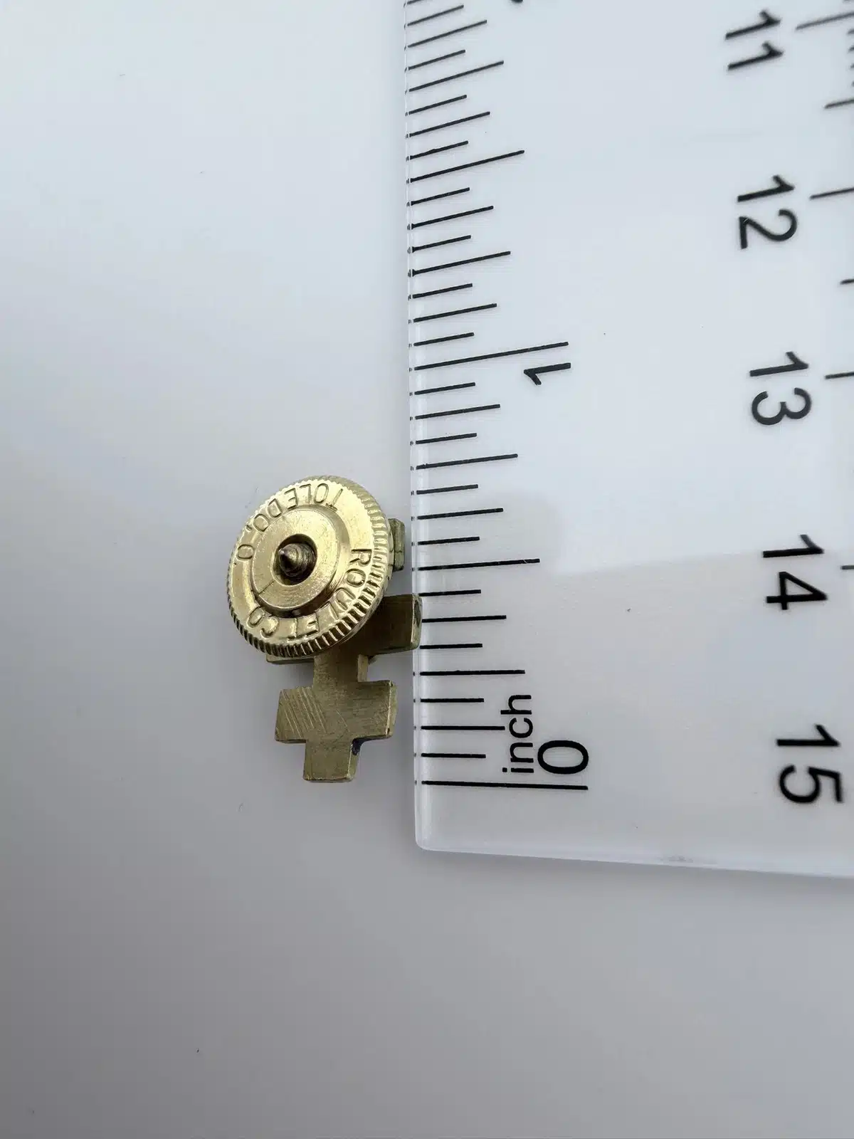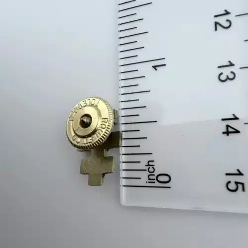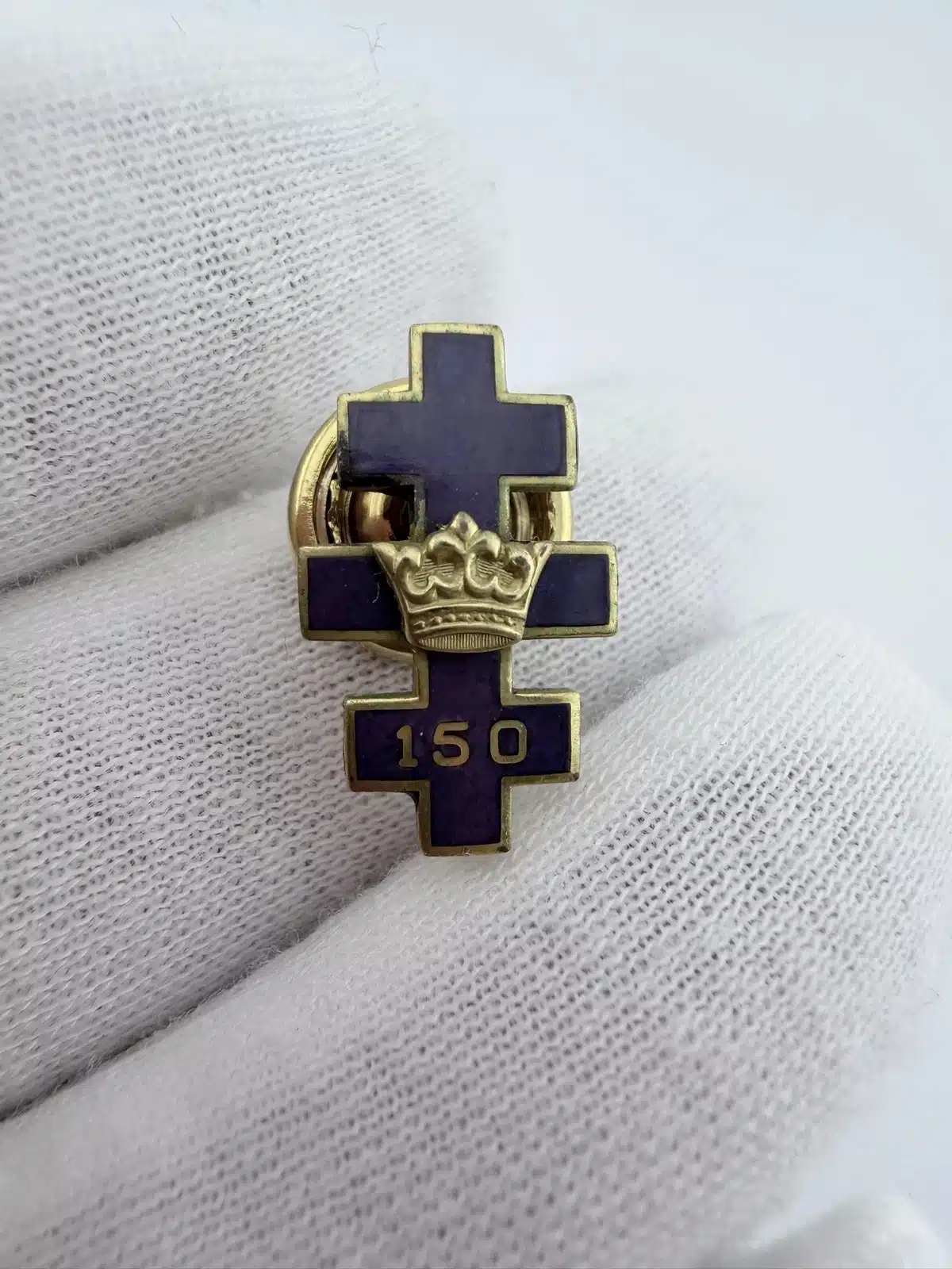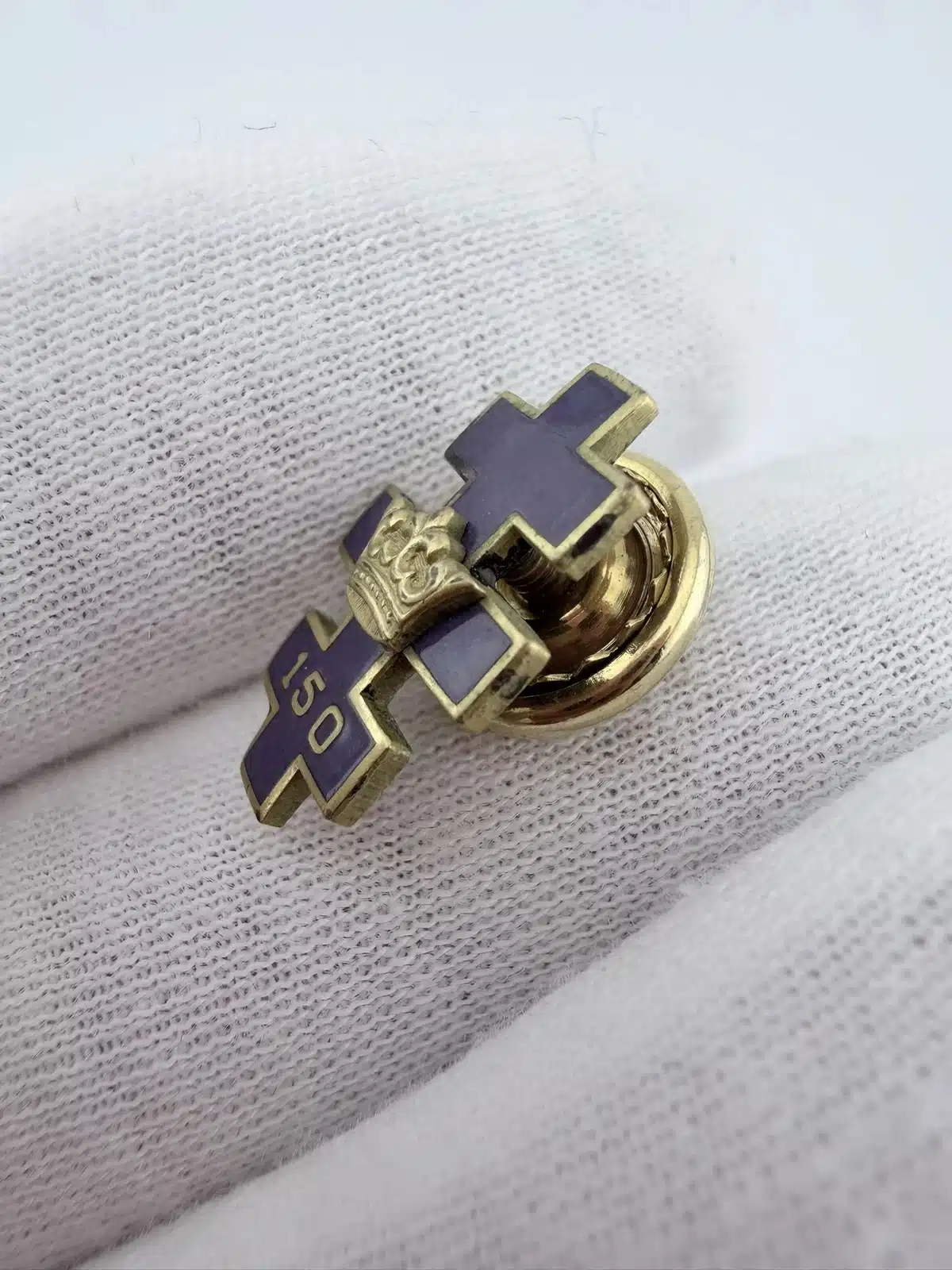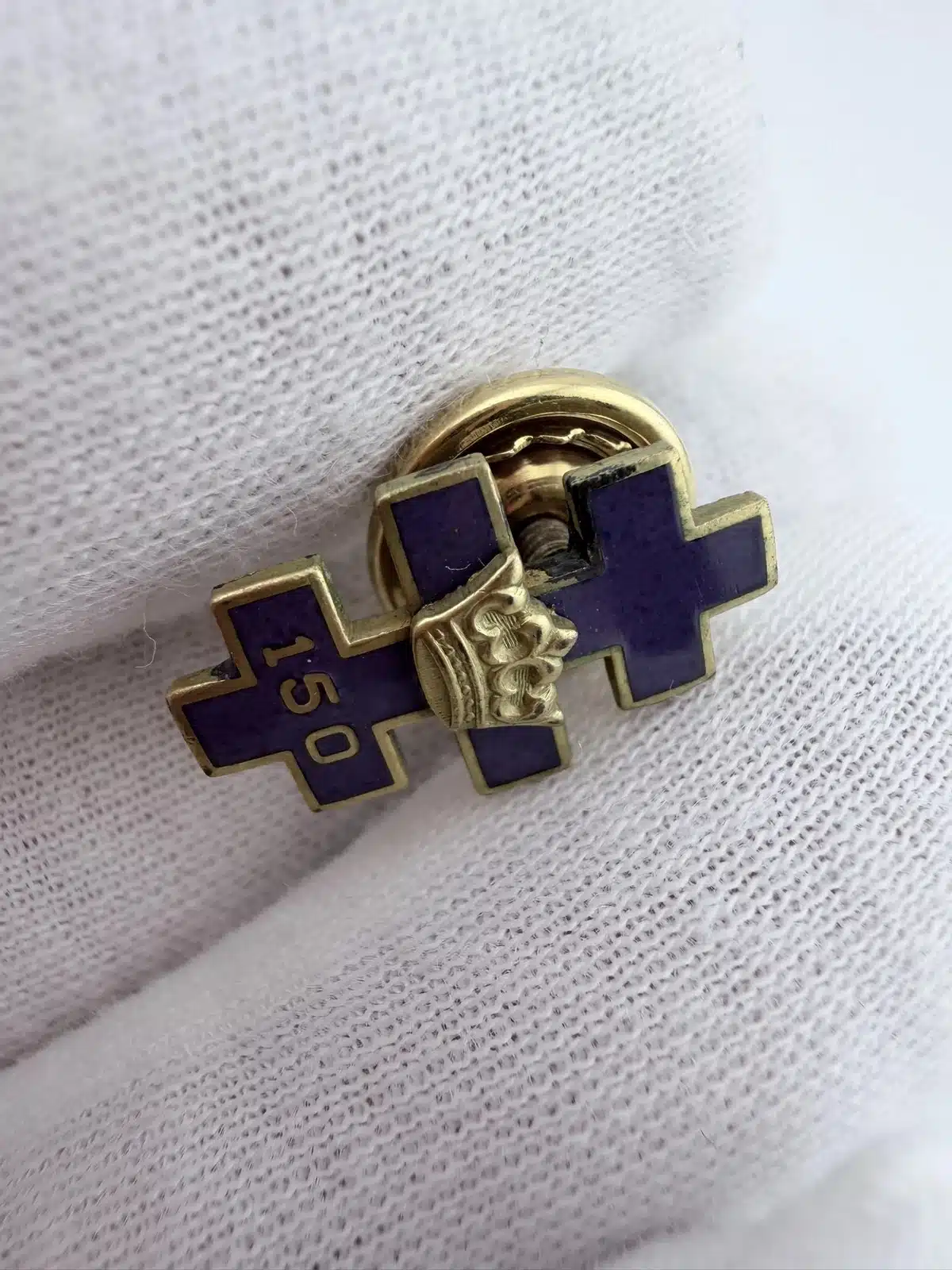 This pin features a unique cross shape with purple enamel and a gold tone crown at the center. It also features the number 150. Unsure on the exact meaning.