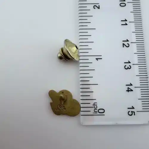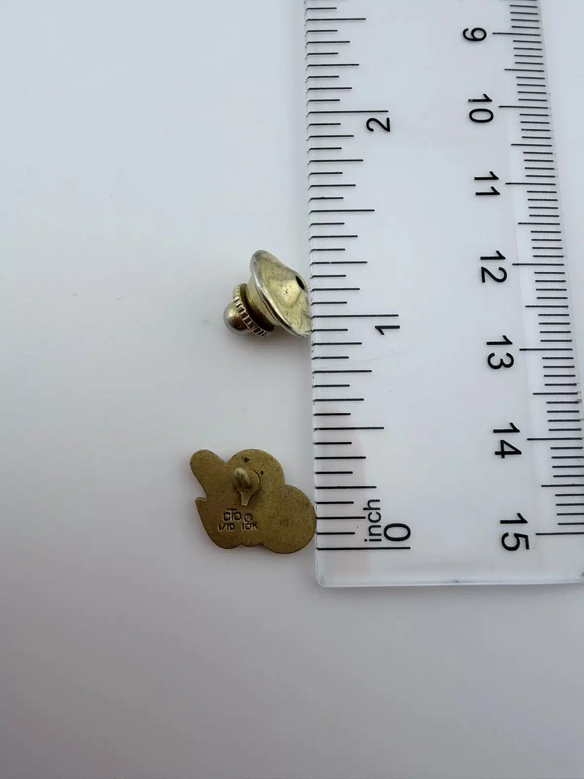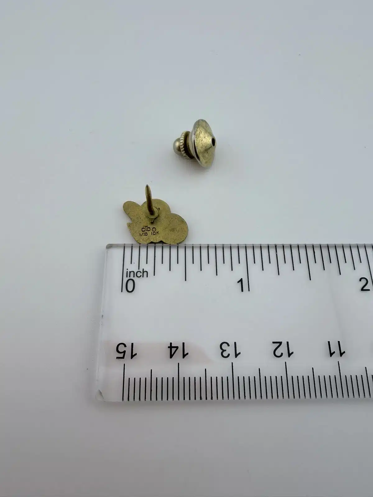 Marked 1/10 10K GF, the pin measures approximately 1/2 inch in width by just under 1/2 inch in height.