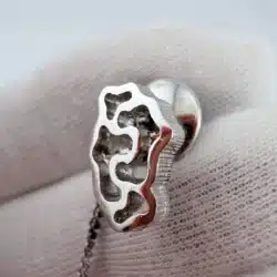 This DB Dolan Bullock sterling silver tie tack features an abstract design composed of multiple interlocking shapes, giving it a an artistic presence. The form invites interpretation, making it a distinctive piece for those who appreciate modernist jewelry and creative design.