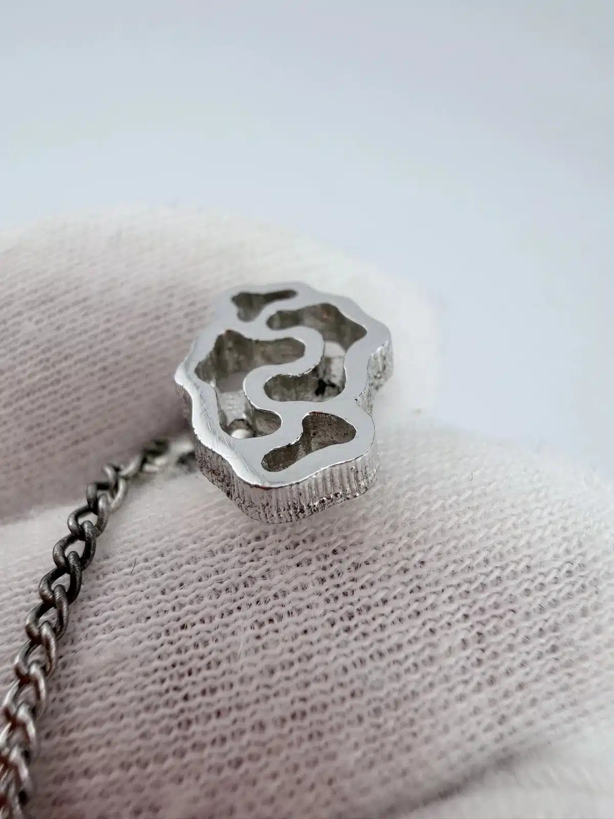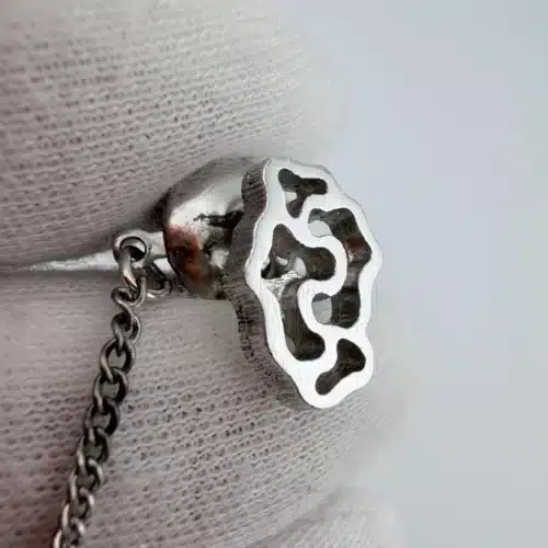 This DB Dolan Bullock sterling silver tie tack features an abstract design composed of multiple interlocking shapes, giving it a an artistic presence. The form invites interpretation, making it a distinctive piece for those who appreciate modernist jewelry and creative design.
