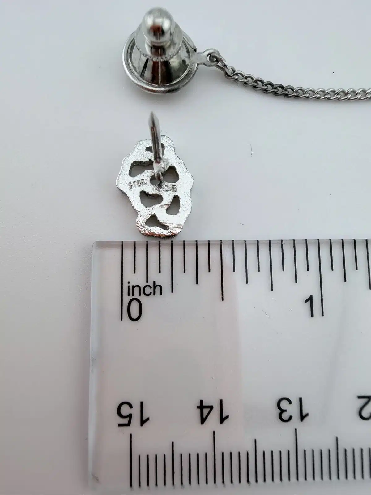 Crafted in sterling silver, the tie tack has a refined yet understated look that pairs well with both formal and business attire. It measures just over 1/4 inches in width and approximately 1/2 inches in height, giving it a compact profile while still showcasing its dimensional detail.