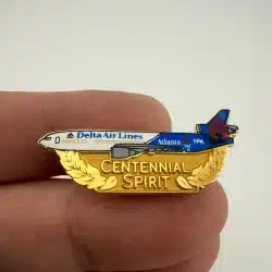 Delta Airlines Centennial Spirit pin commemorating the 1996 Olympic Games held in Atlanta. The pin features a full graphic of a Delta Airlines airplane and is a notable piece of aviation and Olympic memorabilia.
