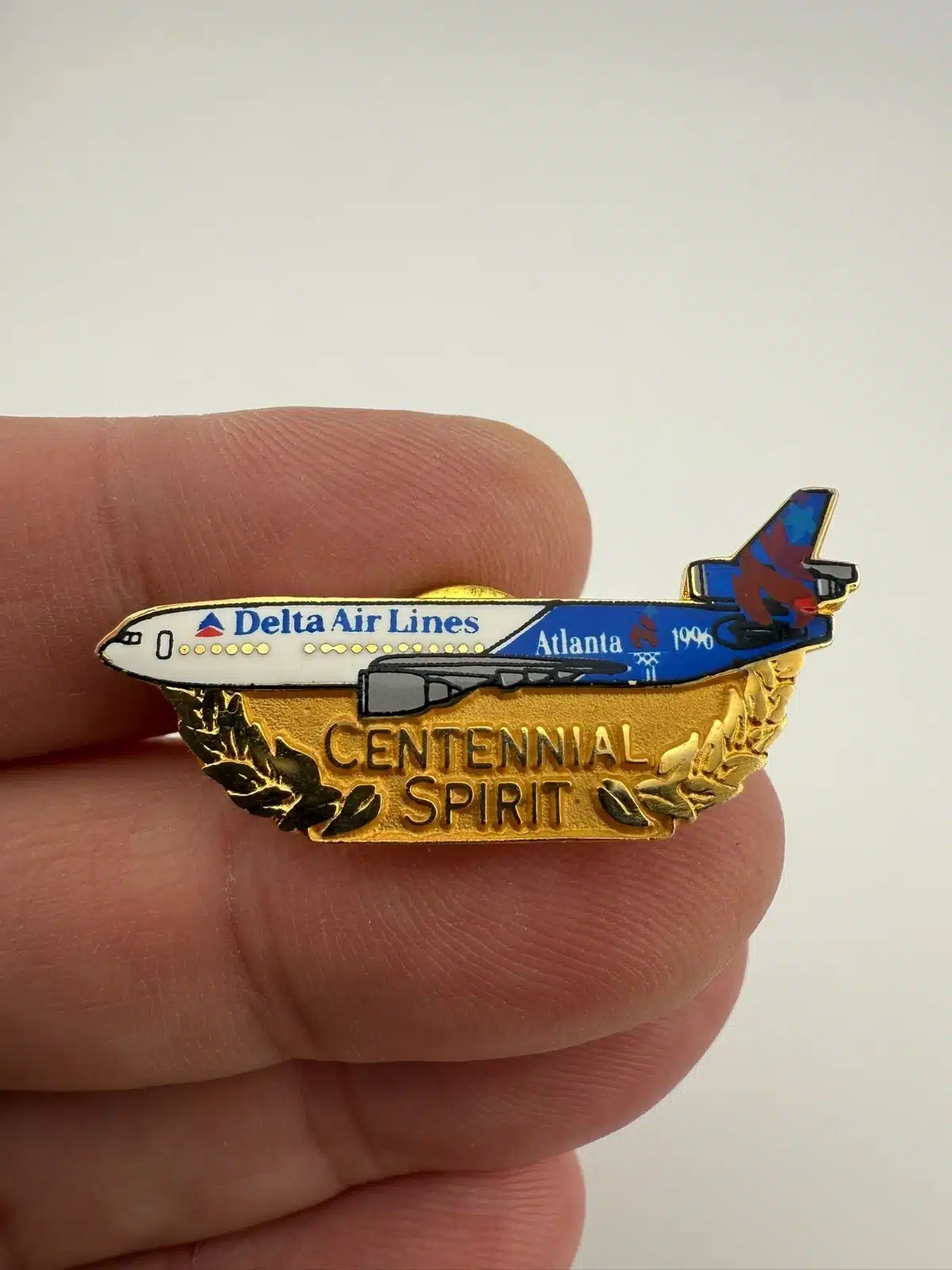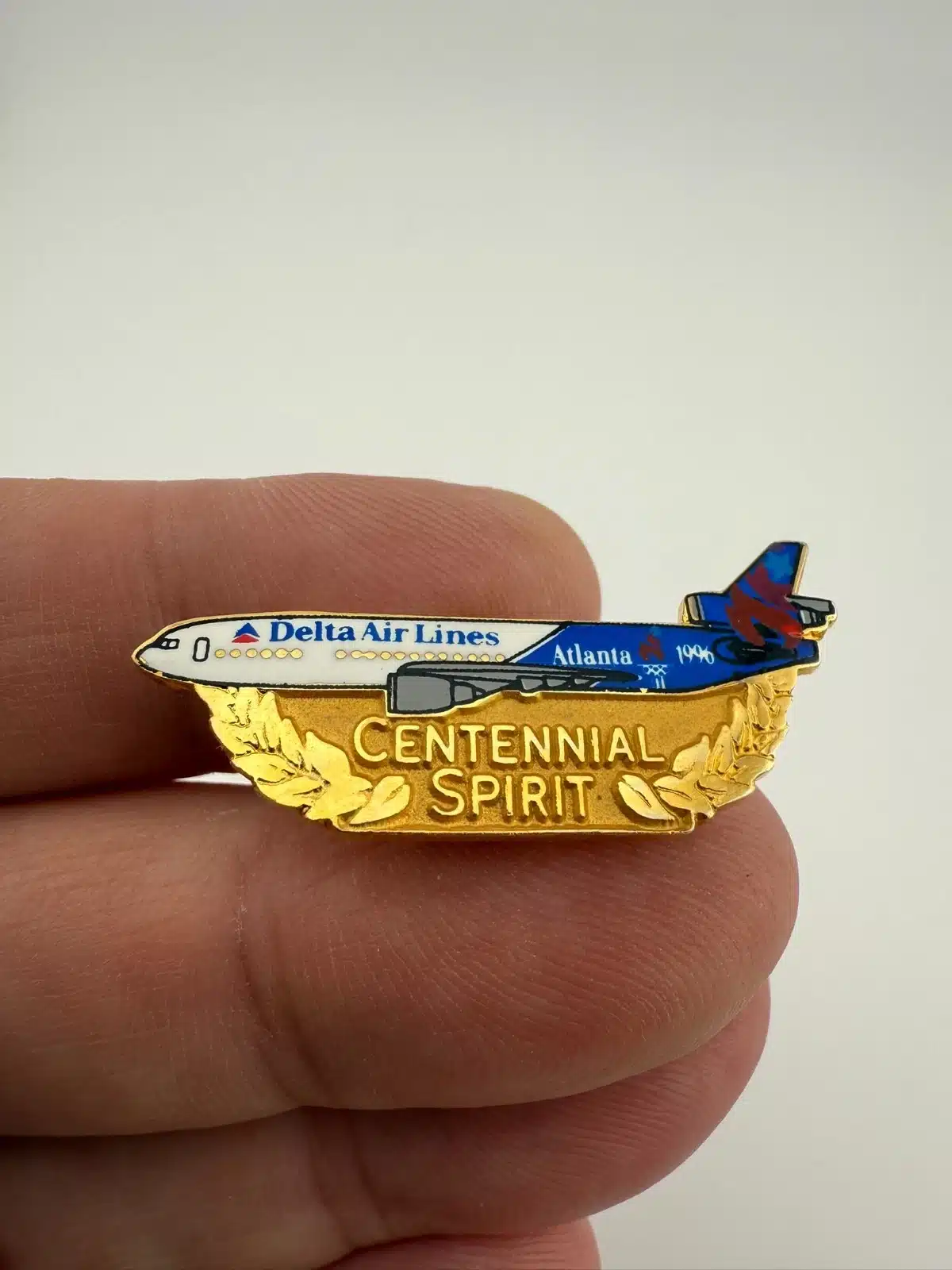 Delta Airlines Centennial Spirit pin commemorating the 1996 Olympic Games held in Atlanta. The pin features a full graphic of a Delta Airlines airplane and is a notable piece of aviation and Olympic memorabilia.