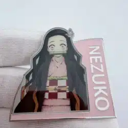 This pin features Nezuko Kamado, a prominent character from the popular anime and manga series Demon Slayer, known for her distinctive pink kimono and bamboo muzzle. Her design captures her fierce yet gentle spirit, embodying the themes of family and resilience that resonate throughout the series.
