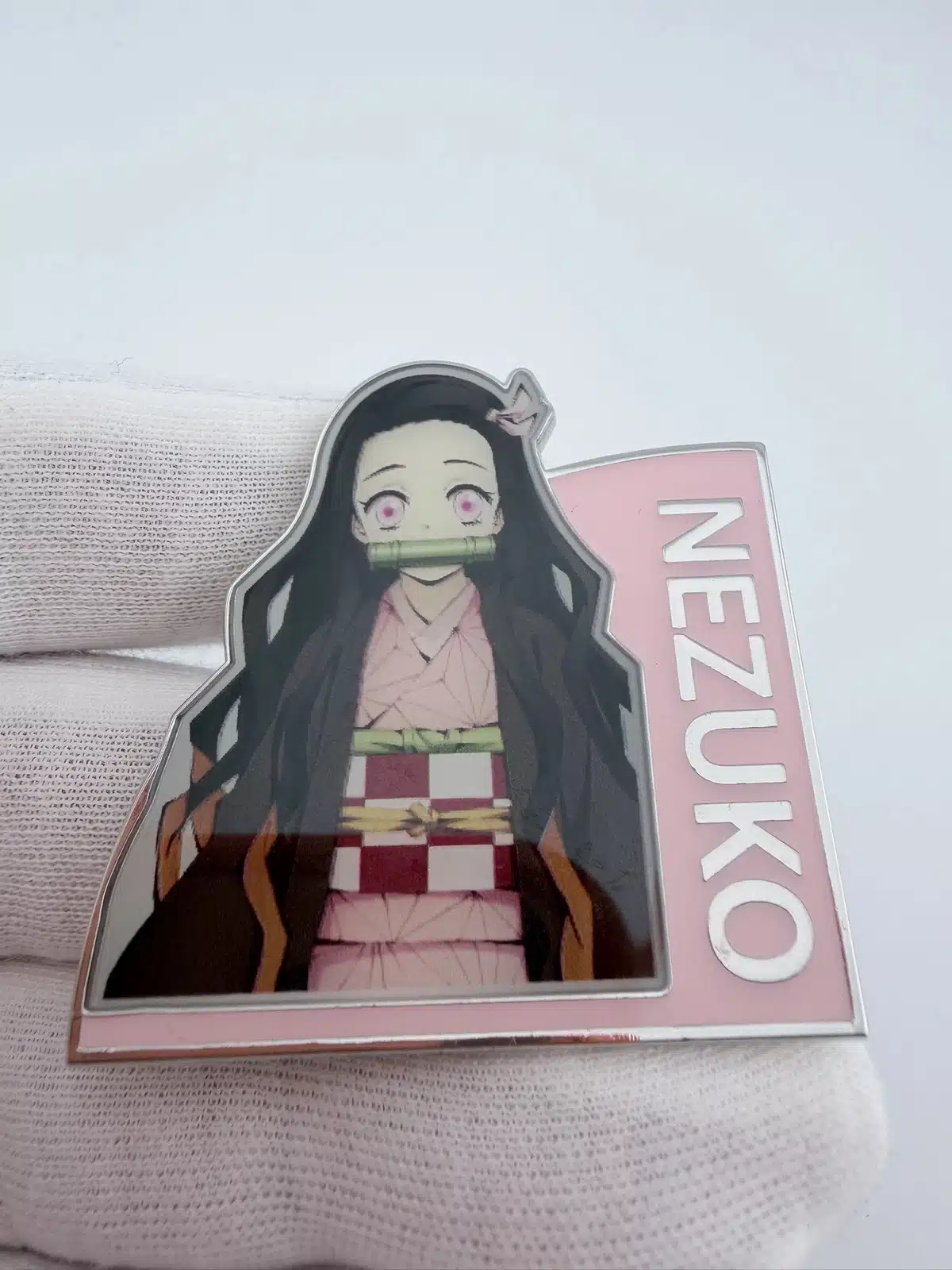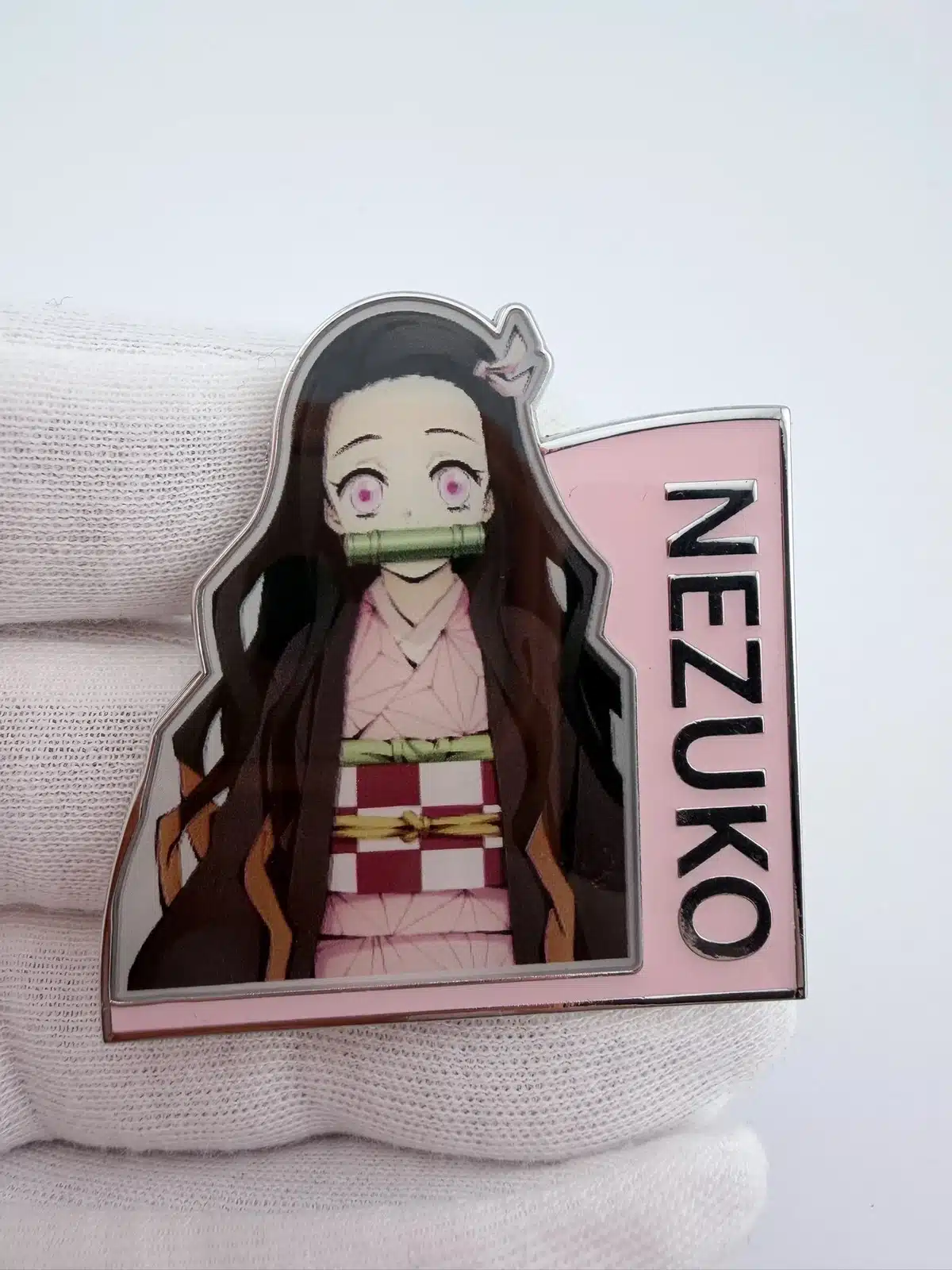 This pin features Nezuko Kamado, a prominent character from the popular anime and manga series Demon Slayer, known for her distinctive pink kimono and bamboo muzzle. Her design captures her fierce yet gentle spirit, embodying the themes of family and resilience that resonate throughout the series.