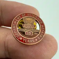 This pin features the emblem of the Department of Veterans Affairs, symbolizing dedication and service to veterans over a span of 15 years. It also comes in the original box.