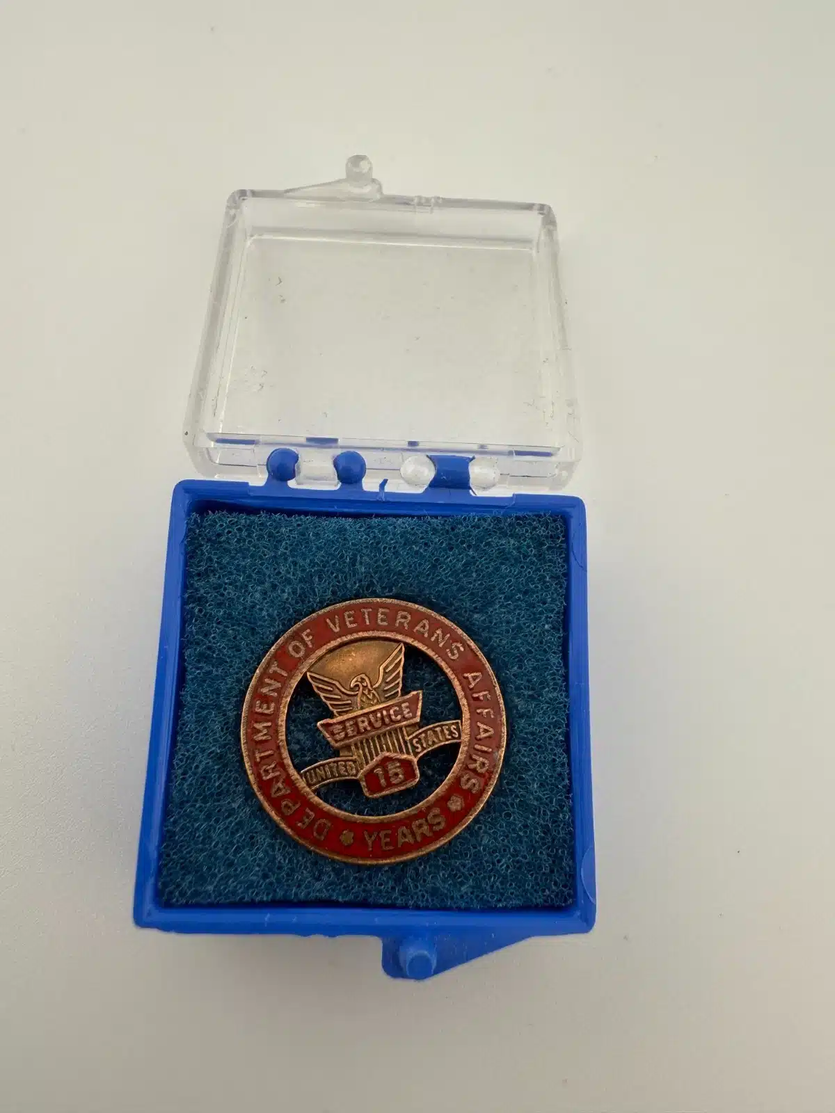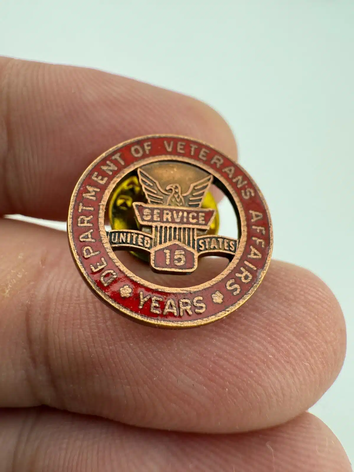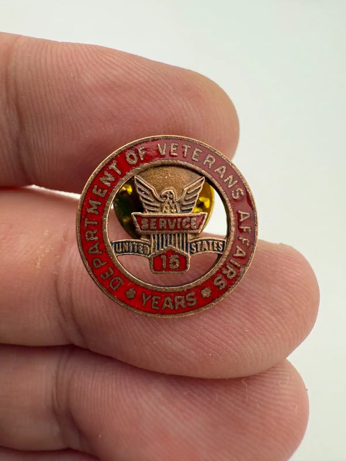 This pin features the emblem of the Department of Veterans Affairs, symbolizing dedication and service to veterans over a span of 15 years. It also comes in the original box.