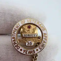 This pin celebrates 30 years of dedicated service to the Department of Veterans Affairs, featuring the organization’s emblem prominently displayed. Crafted from 1/20 10K gold fill, it symbolizes the commitment and contributions of employees who have served for three decades.