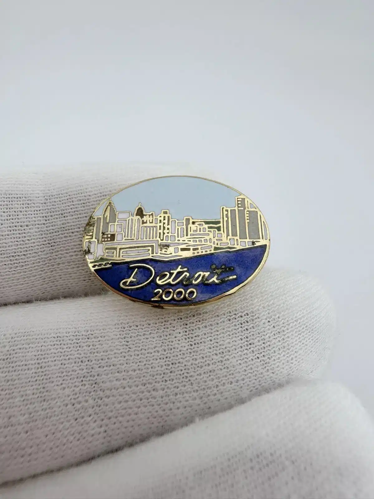 This pin features a vibrant depiction of the Detroit skyline set against a light blue sky, with a striking blue water base that symbolizes the Great Lakes. The inscription ‘Detroit 2000’ is written over the water, marking the turn of the millennium for this iconic city.