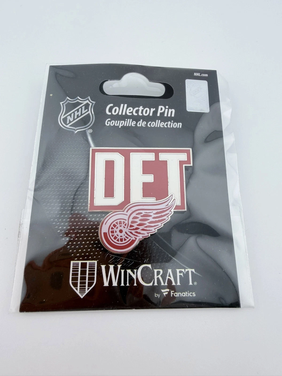This Detroit Redwings pin features the letters “DET” at the top with a winged wheel design below. The colors include red, white, and silver.
