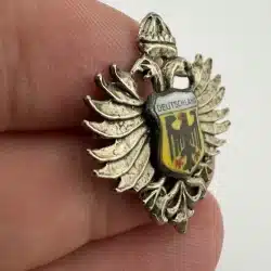 The eagle has long been a national symbol of Germany, commonly used in crests and official emblems, with variations appearing across different historical periods and organizations. Pin measures approximately 1 inch in width by over 1 1/4 inch in height.