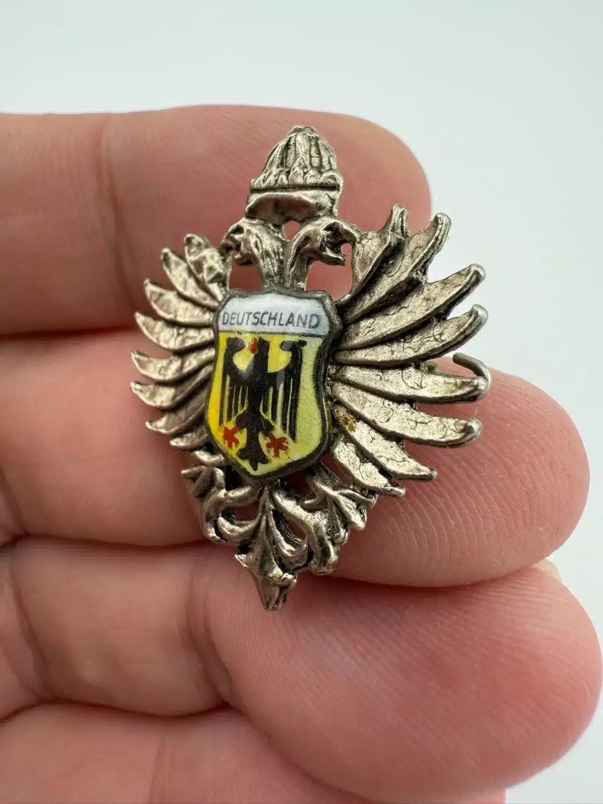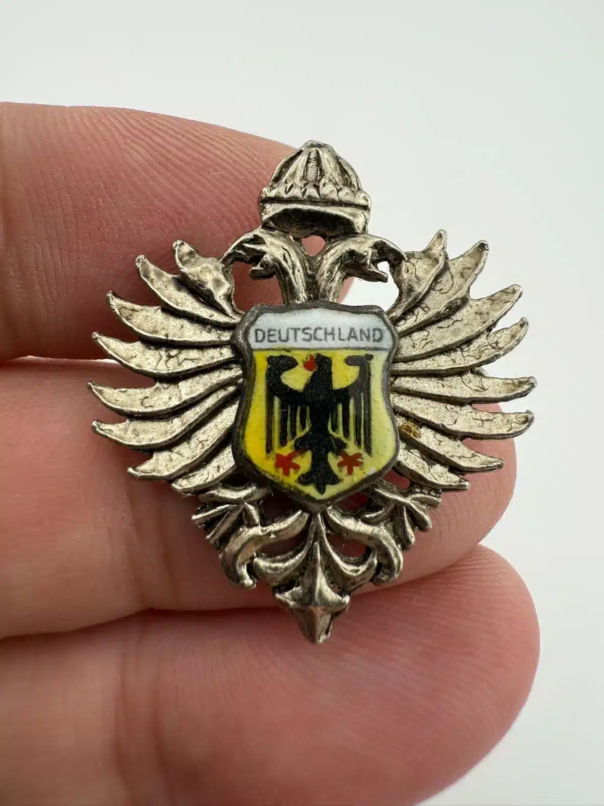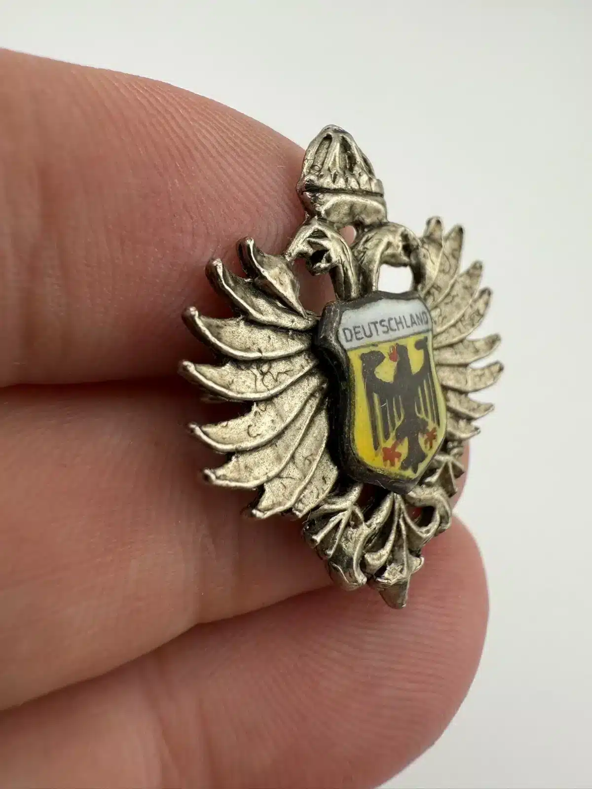 The eagle has long been a national symbol of Germany, commonly used in crests and official emblems, with variations appearing across different historical periods and organizations. Pin measures approximately 1 inch in width by over 1 1/4 inch in height.