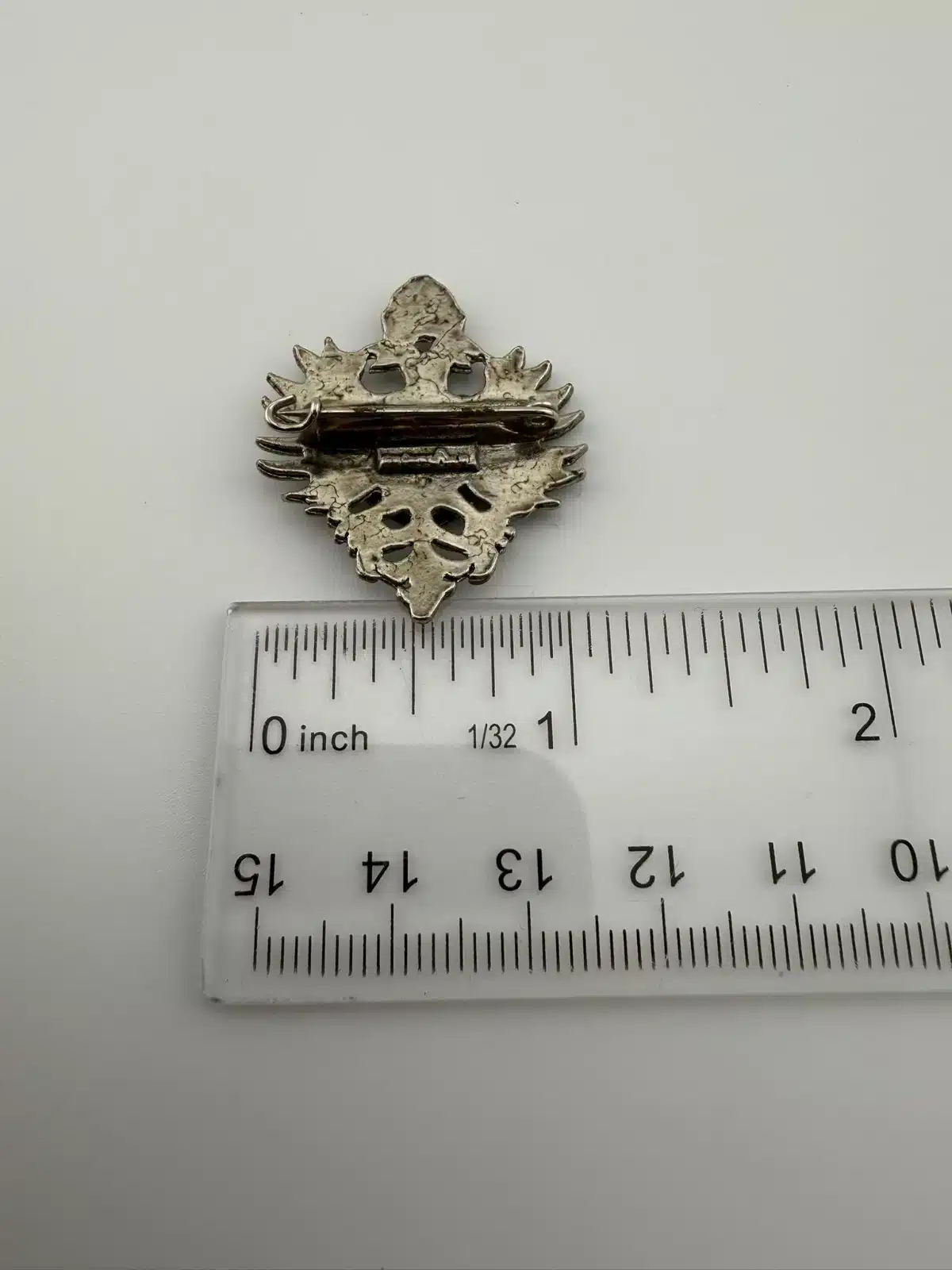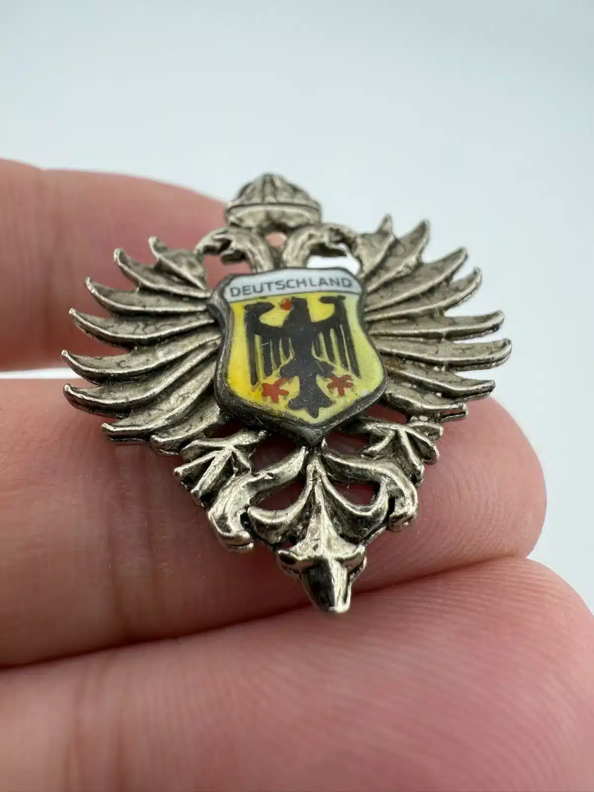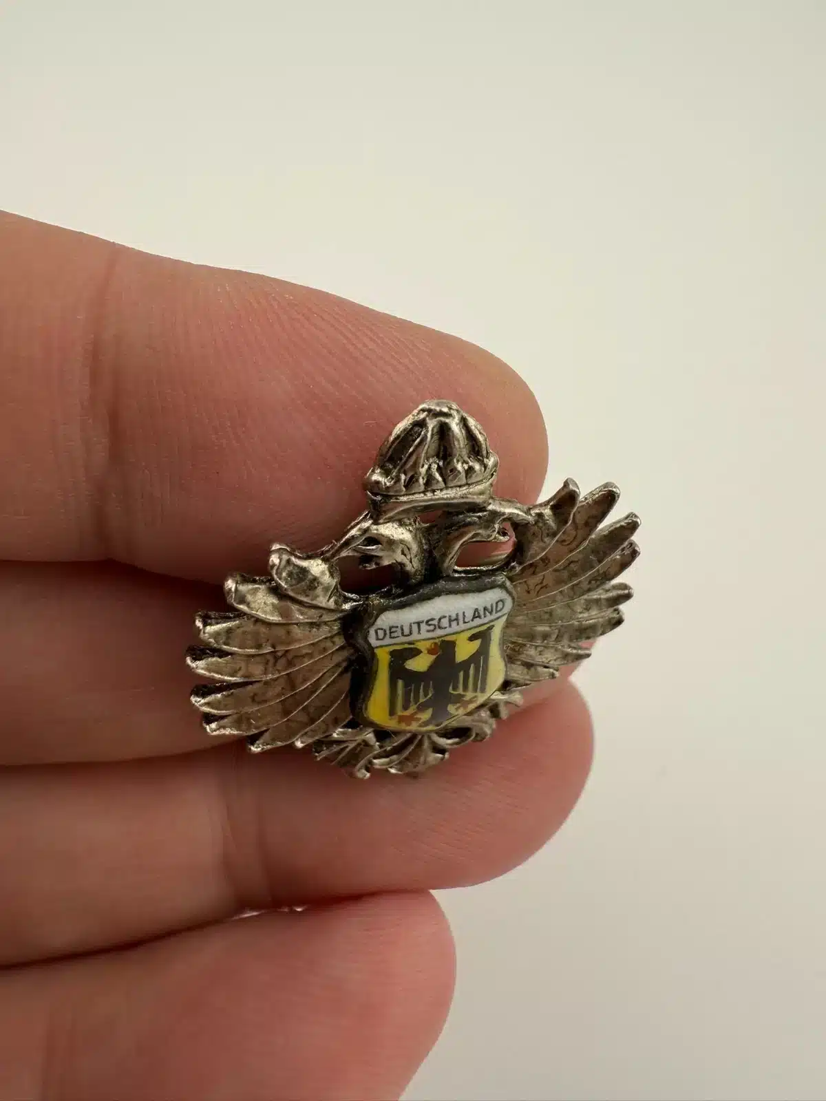 The eagle has long been a national symbol of Germany, commonly used in crests and official emblems, with variations appearing across different historical periods and organizations. Pin measures approximately 1 inch in width by over 1 1/4 inch in height.
