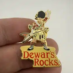 This lapel hat pin features a Scotsman in a traditional kilt, expertly crafted with intricate detailing, holding a guitar that symbolizes Scottish musical heritage. The pin is a tribute to Dewar’s, a renowned Scotch whisky brand, reflecting the brand’s deep roots in Scottish culture and its celebration of local artistry.