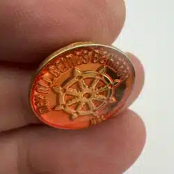 This pin features the Dharmachakra, or Dharma Wheel, a symbol representing the teachings of Buddhism and the path to enlightenment. The inscription ‘May All Beings Be Happy’ reflects the core Buddhist principle of compassion and the desire for the well-being of all sentient beings.