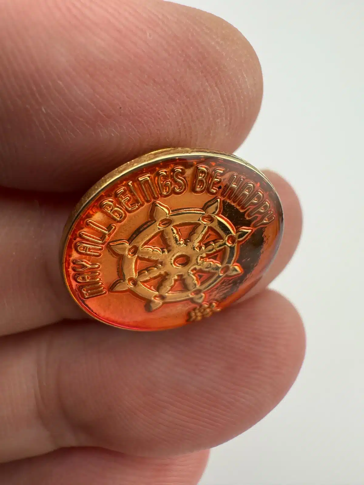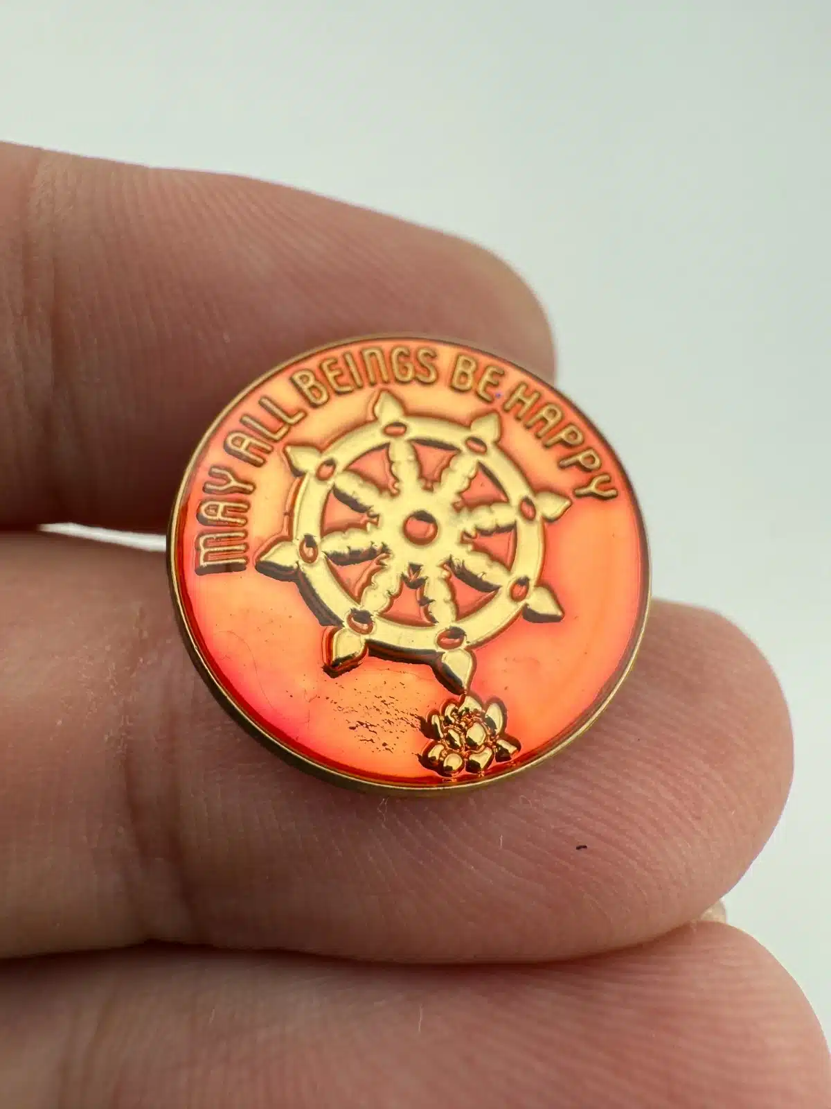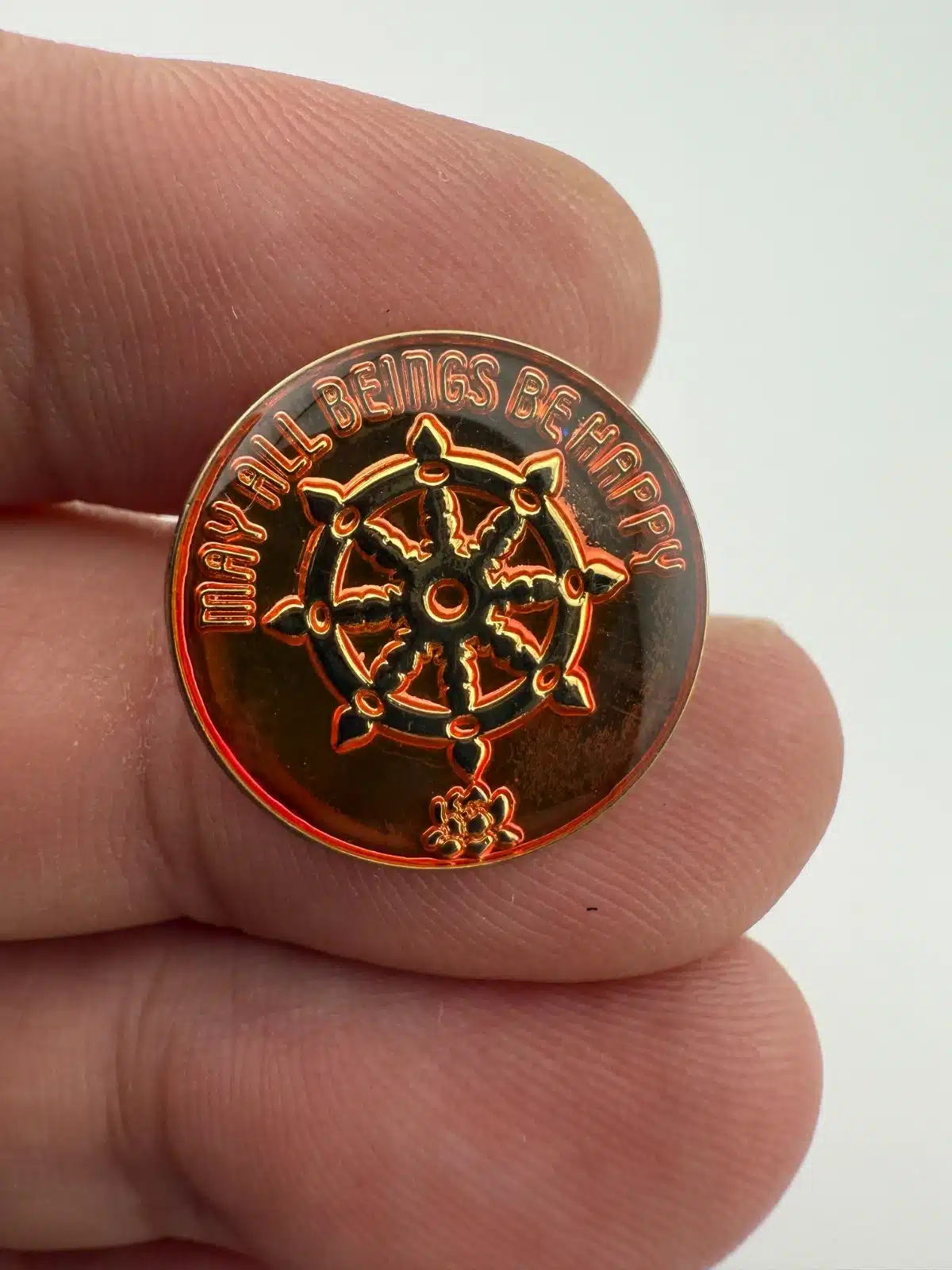 This pin features the Dharmachakra, or Dharma Wheel, a symbol representing the teachings of Buddhism and the path to enlightenment. The inscription ‘May All Beings Be Happy’ reflects the core Buddhist principle of compassion and the desire for the well-being of all sentient beings.