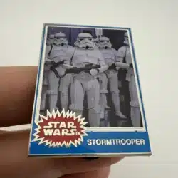 This pin commemorates the 45th anniversary of Star Wars, featuring a blue border that encapsulates a dynamic scene with several Stormtroopers standing around. The bold ‘Star Wars’ lettering in red at the bottom left enhances the nostalgic appeal of this iconic franchise.