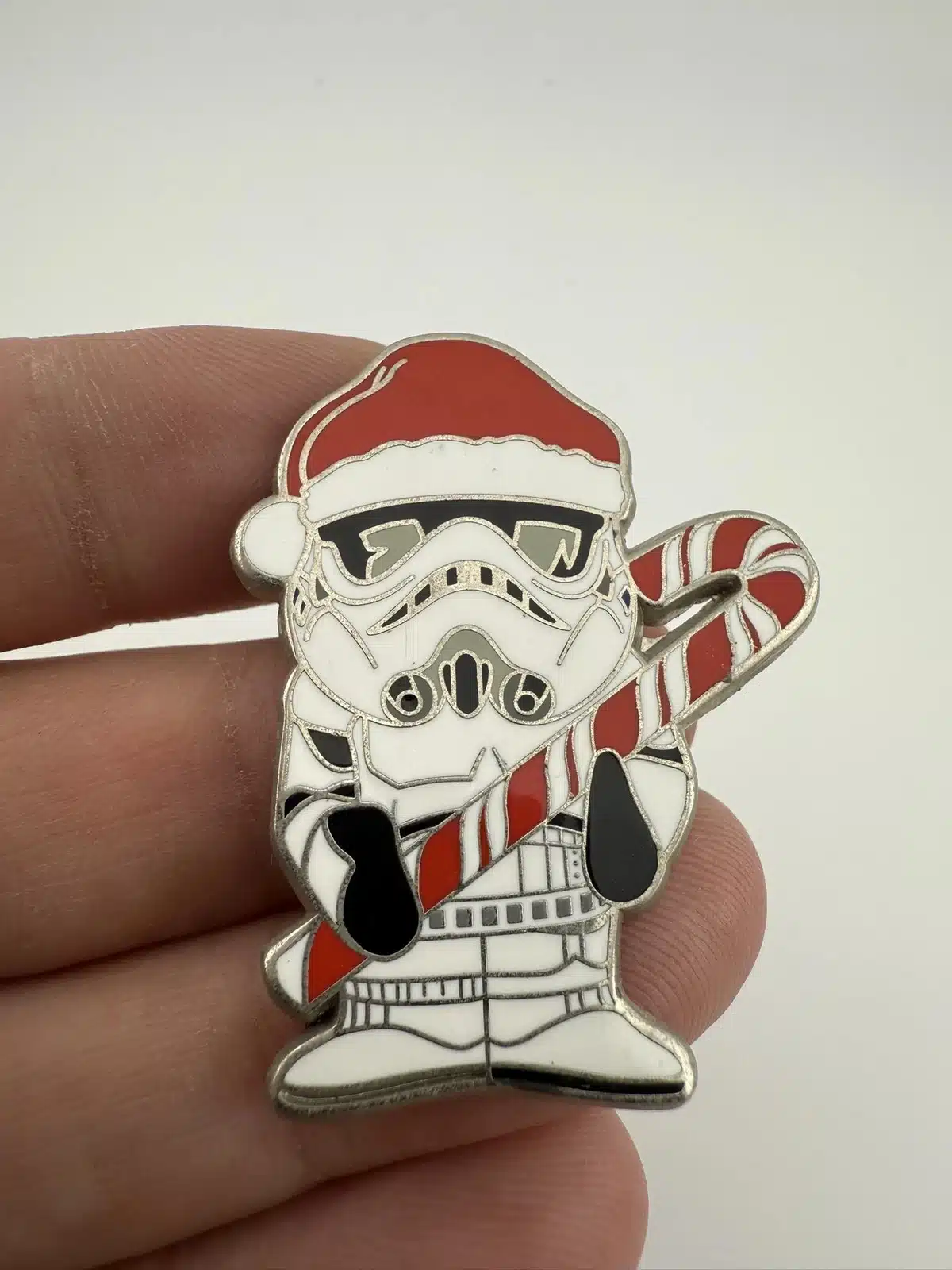 This collectible pin features a Stormtrooper dressed in a festive red Santa hat, embodying the playful spirit of the holiday season. The character is depicted holding a red and white striped candy cane, blending the iconic elements of Star Wars with Christmas cheer.