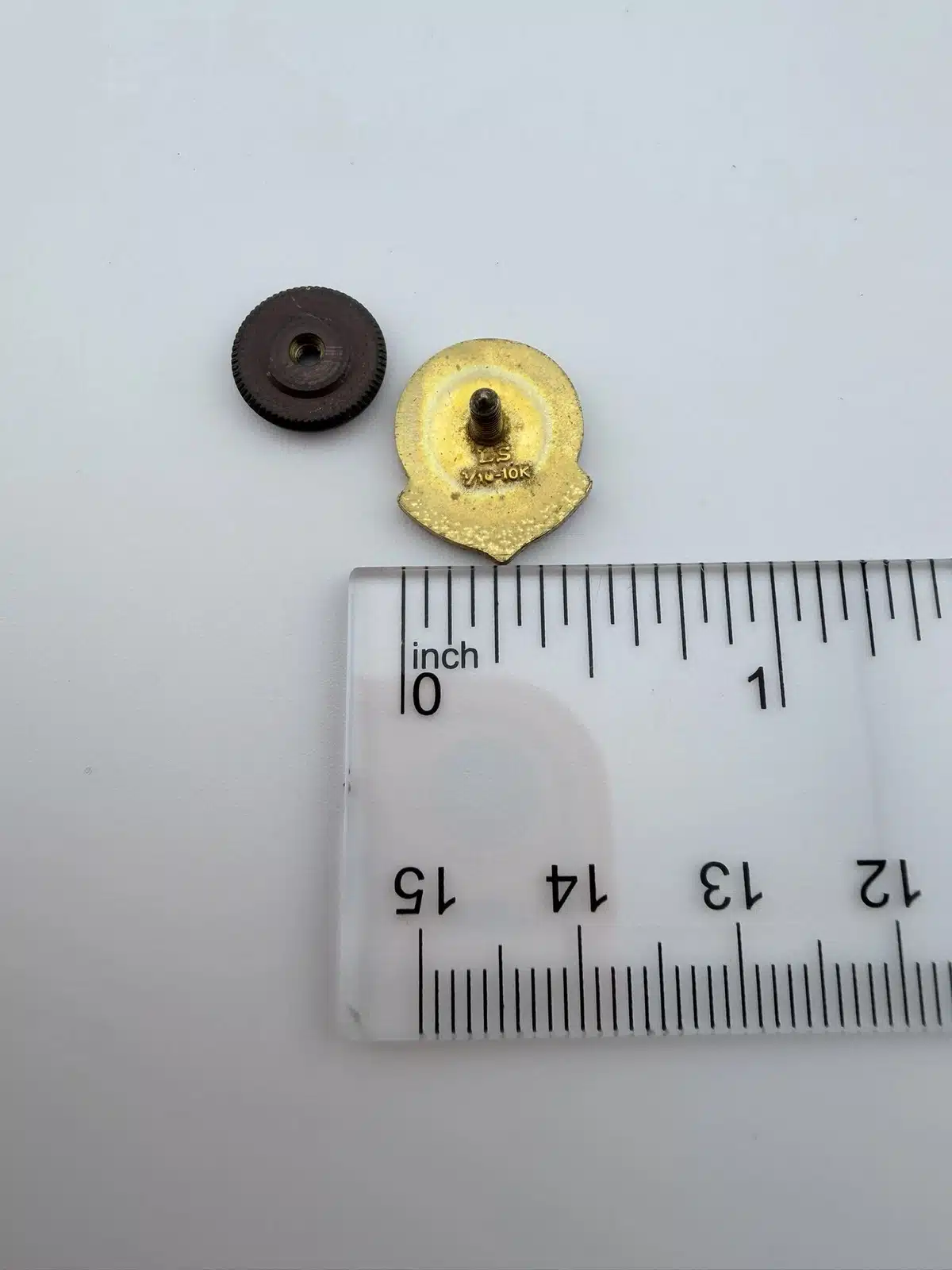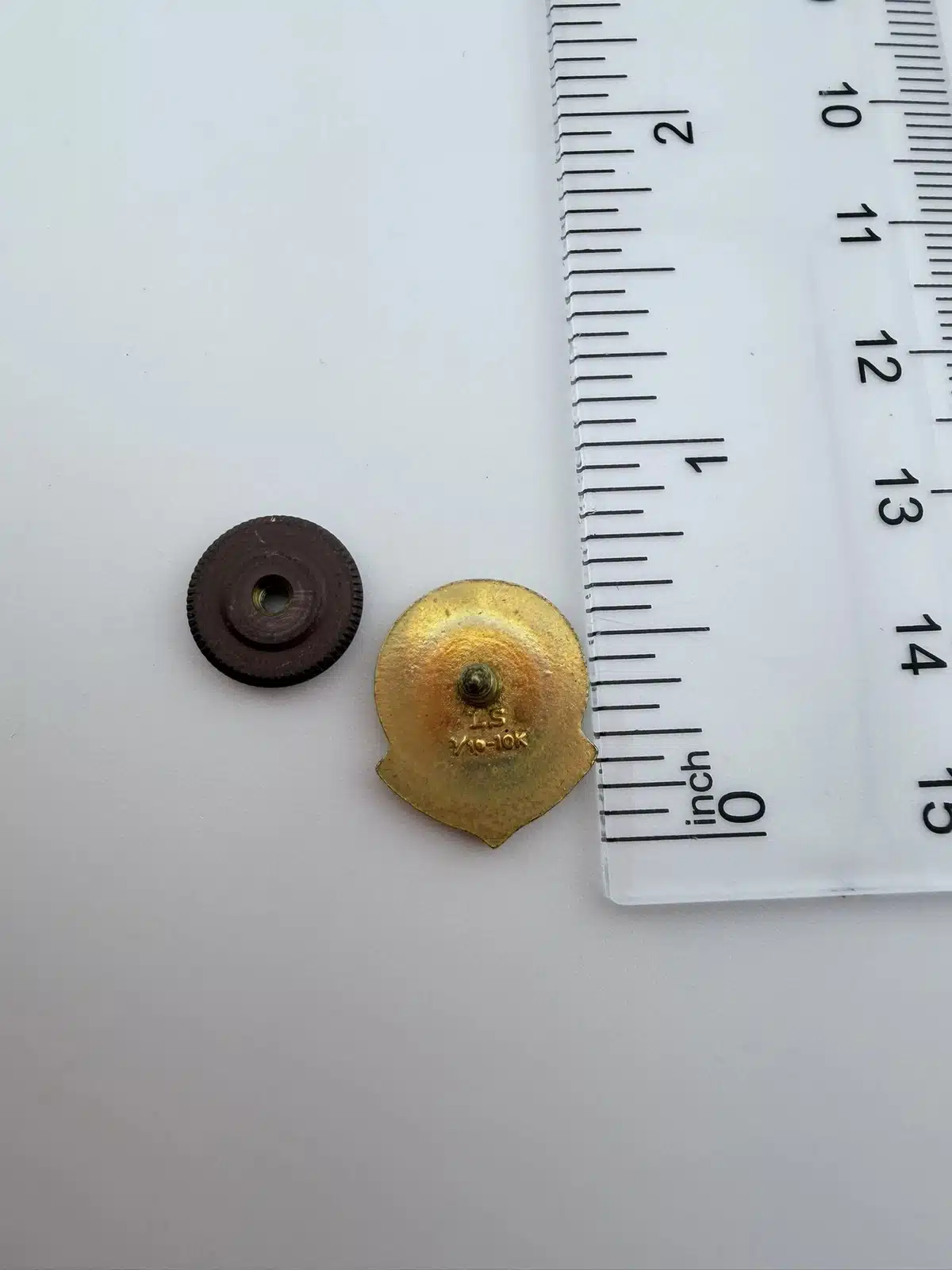Marked 1/10 10K GF and stamped “L.S.” on the rear, the pin measures approximately 1/2 inch in width by just over 1/2 inch in height.