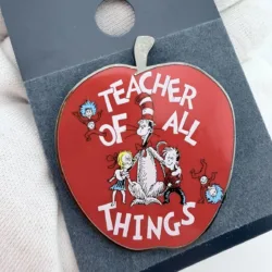 This pin is shaped like a red apple and features the Cat in the Hat, Thing 1, Thing 2, and two children. Within the design it reads “Teacher of All Things.”