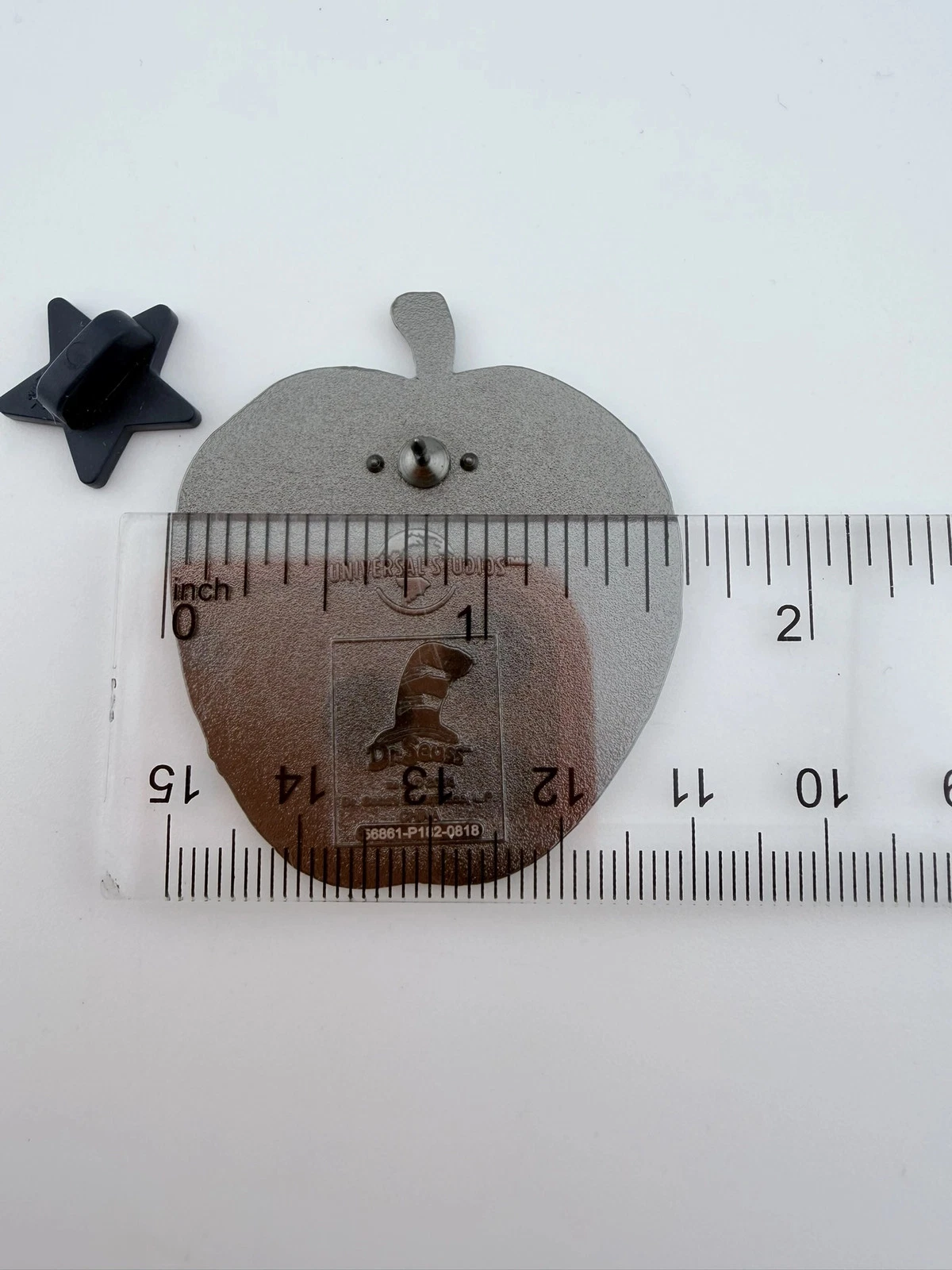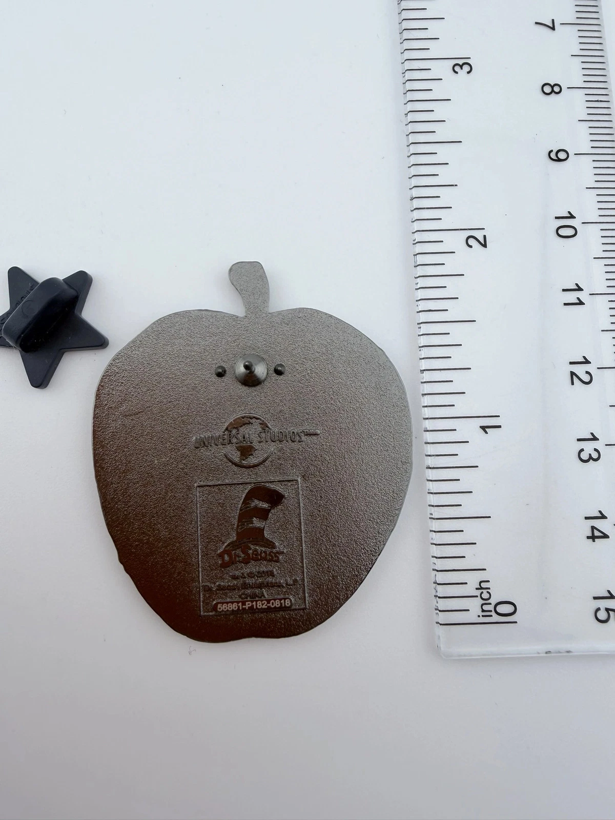 Dr. Seuss characters have long been used on classroom themed items and educational merchandise, and Universal Studios has produced licensed collectibles tied to those characters. The apple shape and wording give this pin a school and teacher focused theme.