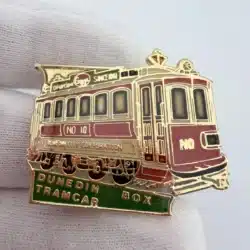 This Dunedin New Zealand Box Tramcar train pin features a gold tone design measuring just under 1.5 inches in width by just over 1 inch in height. The pin depicts a red and white tramcar with the text “Dunedin Box Tramcar” displayed below, highlighting one of the city’s historic streetcar vehicles.