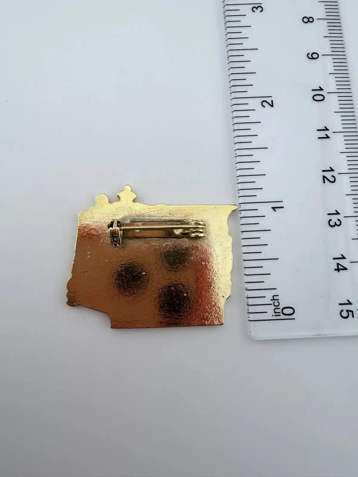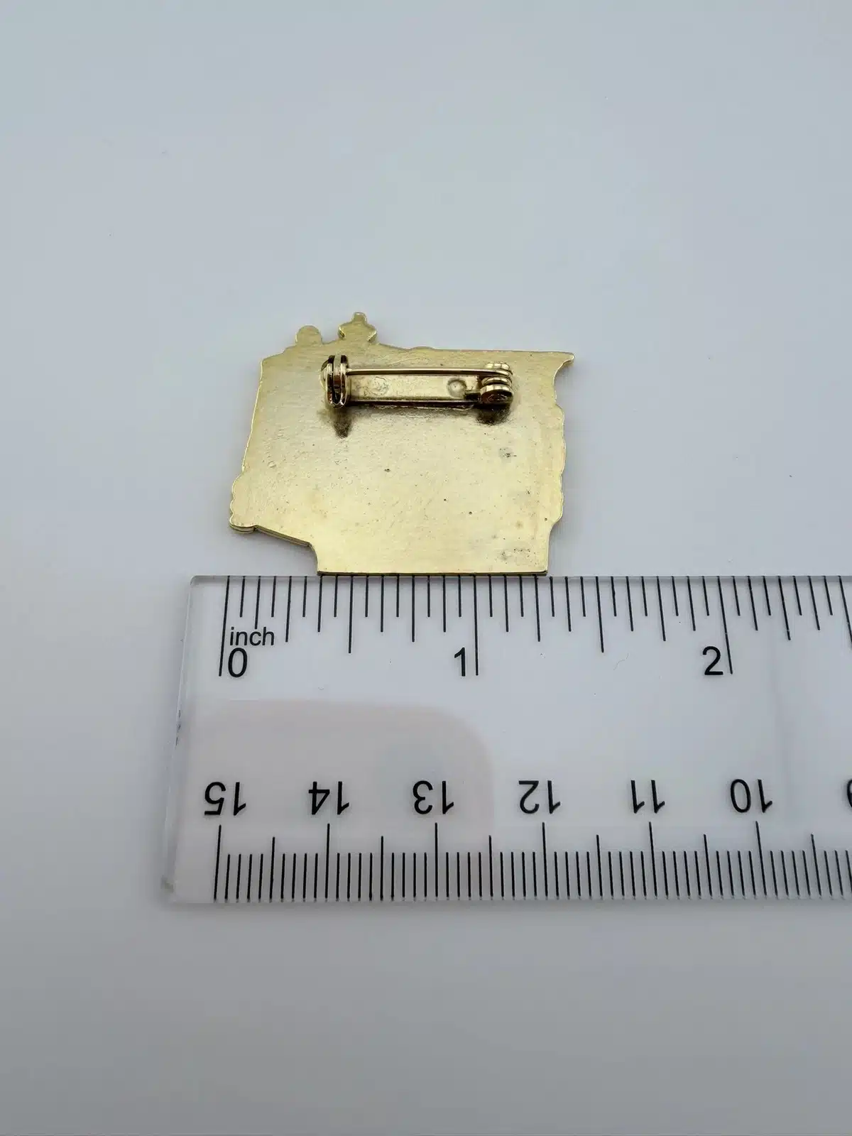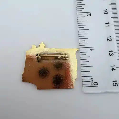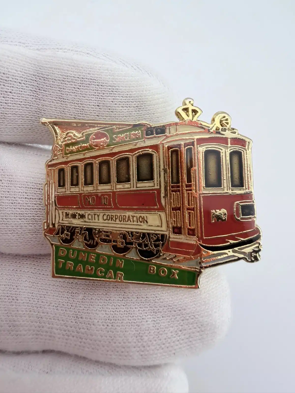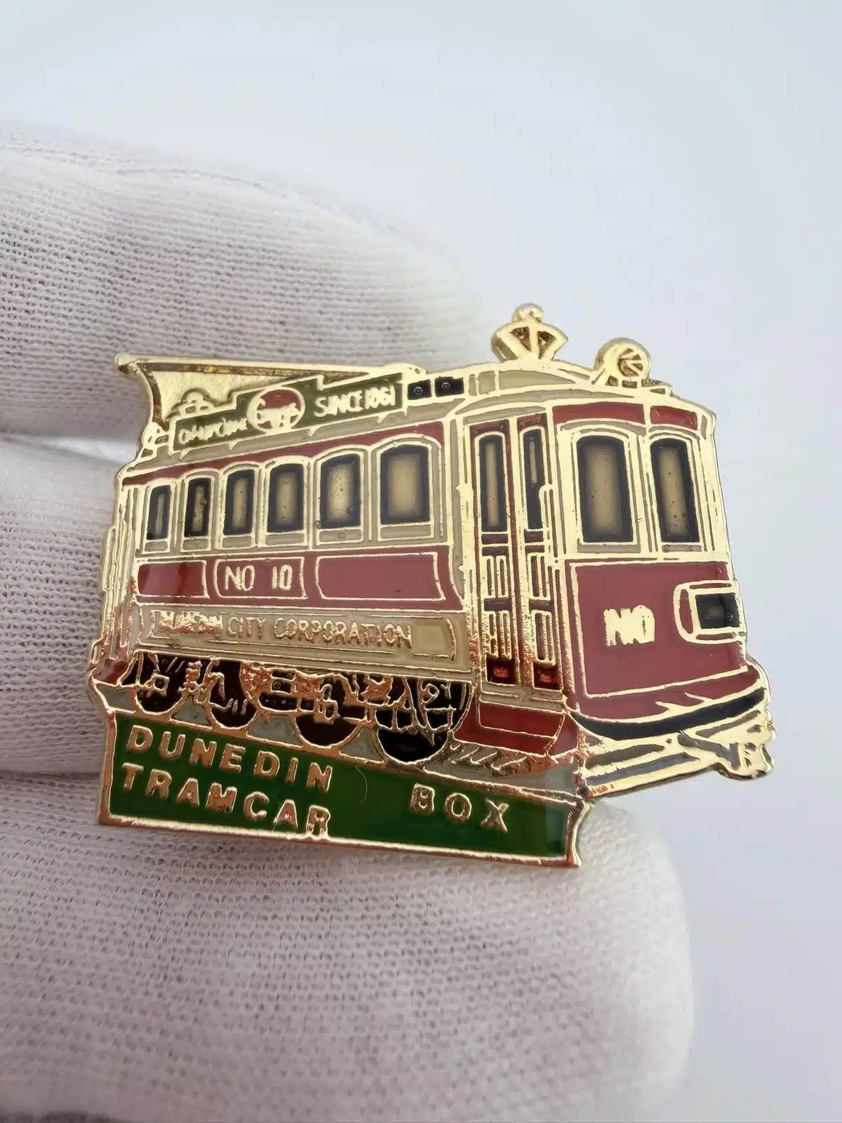 This Dunedin New Zealand Box Tramcar train pin features a gold tone design measuring just under 1.5 inches in width by just over 1 inch in height. The pin depicts a red and white tramcar with the text “Dunedin Box Tramcar” displayed below, highlighting one of the city’s historic streetcar vehicles.