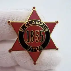 This six-point sheriff’s badge shaped pin features a red background with the number 1855 at the center. Surrounding the number is a black ring bearing the text E Clampus Vitus, creating a bold and emblem-style design.