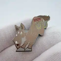 This pin features a donkey in a kicking pose with its rear legs about to strike, each hoof fitted with a horseshoe. The donkey’s rear displays the letters ECV in red, adding an interesting focal point to the playful and animated design.