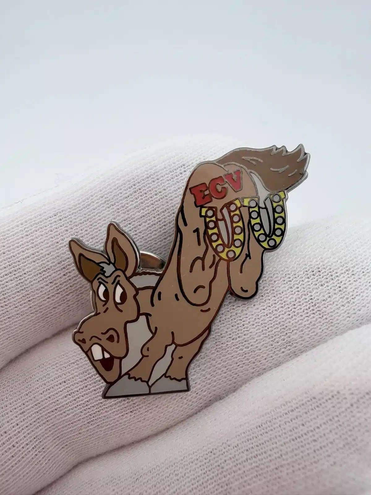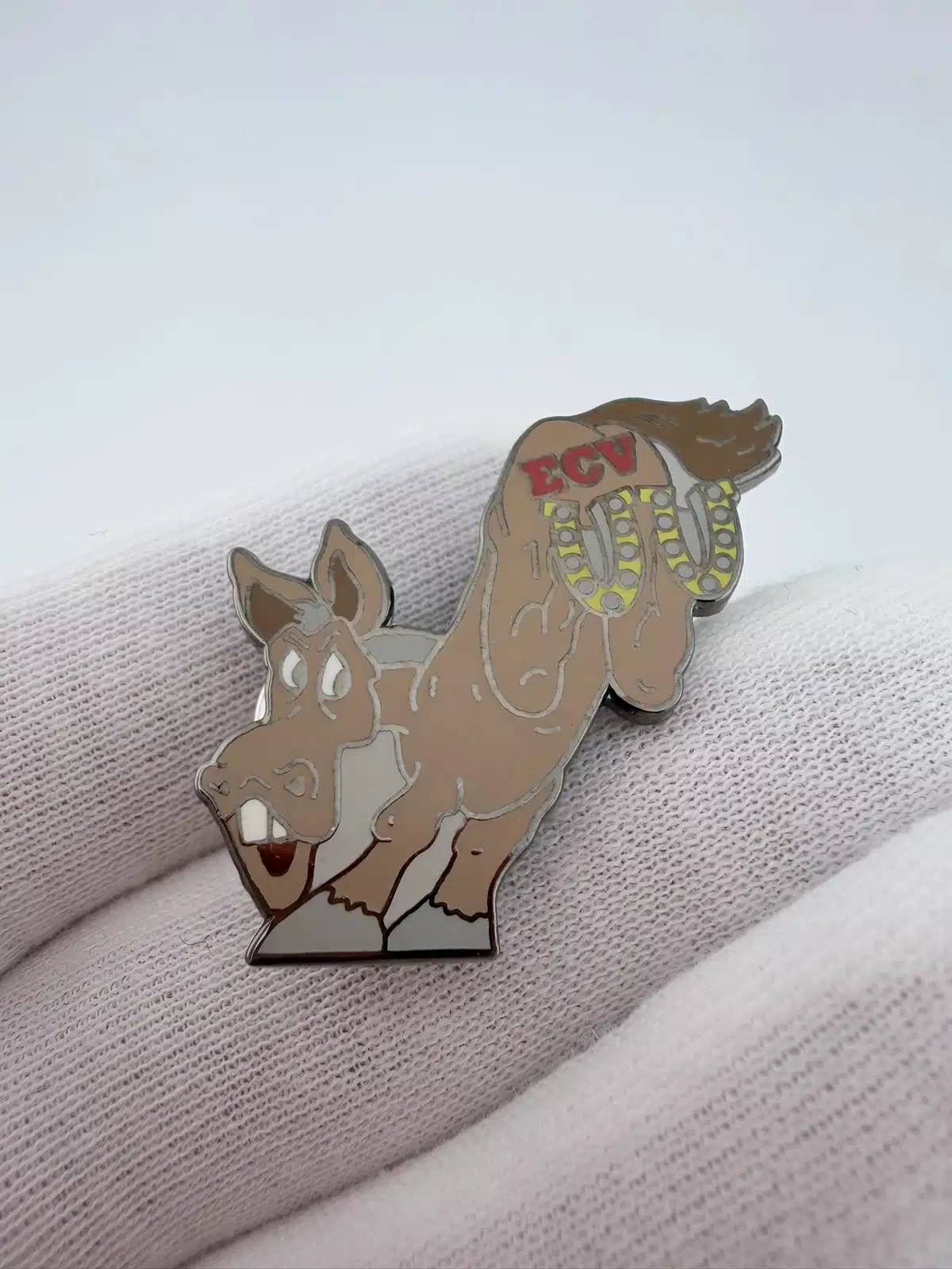 This pin features a donkey in a kicking pose with its rear legs about to strike, each hoof fitted with a horseshoe. The donkey’s rear displays the letters ECV in red, adding an interesting focal point to the playful and animated design.