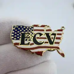 This pin features an intentionally incorrect outline of the United States filled with an American flag graphic, with the letters ECV displayed in black across the front. The unusual map shape gives the design a humorous, stylized look that fits the group’s playful visual approach.