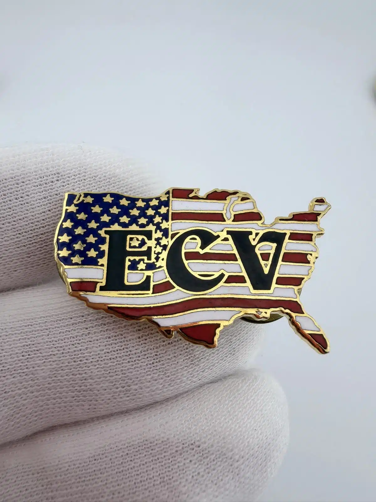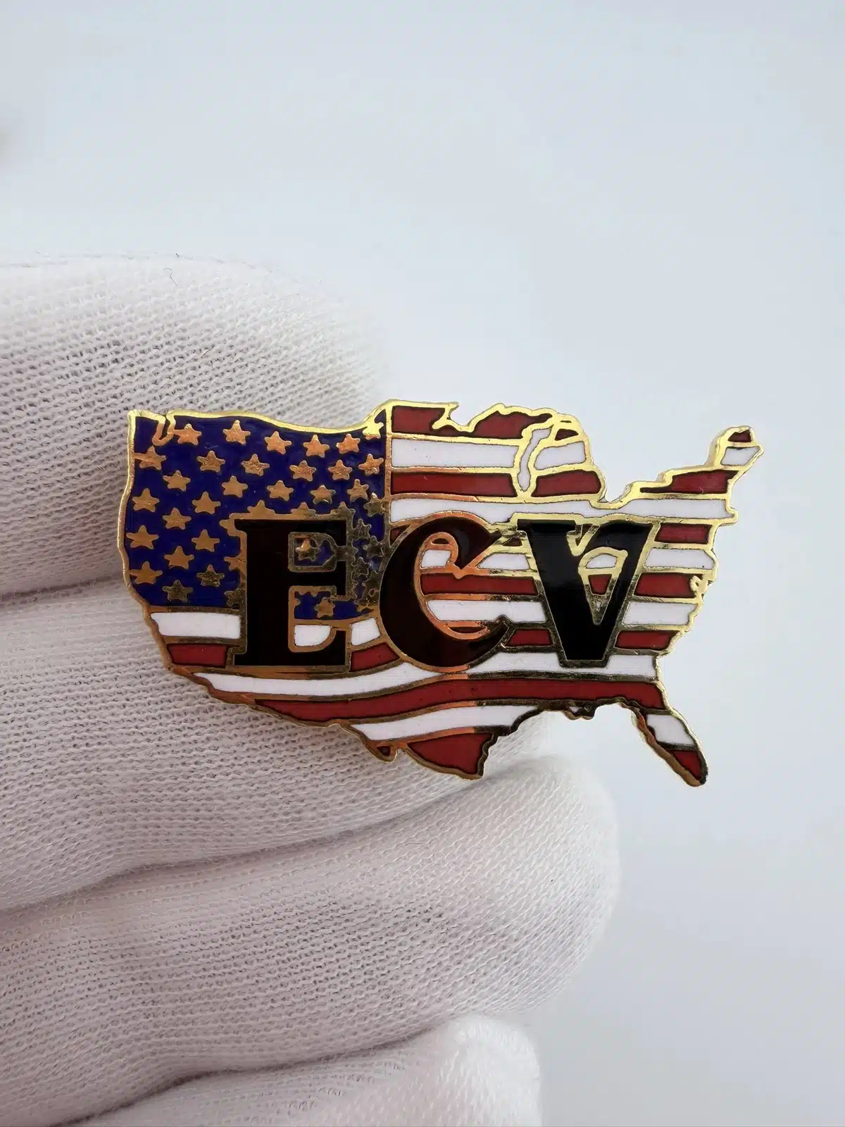 This pin features an intentionally incorrect outline of the United States filled with an American flag graphic, with the letters ECV displayed in black across the front. The unusual map shape gives the design a humorous, stylized look that fits the group’s playful visual approach.